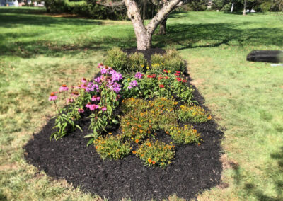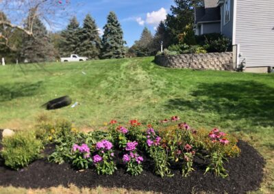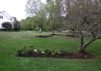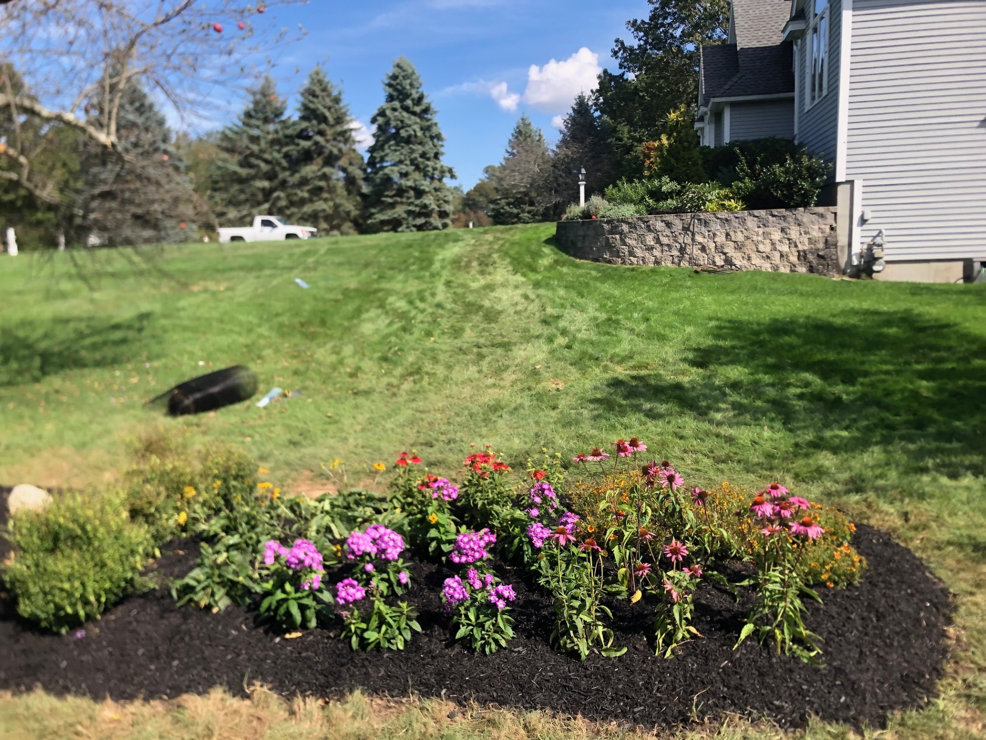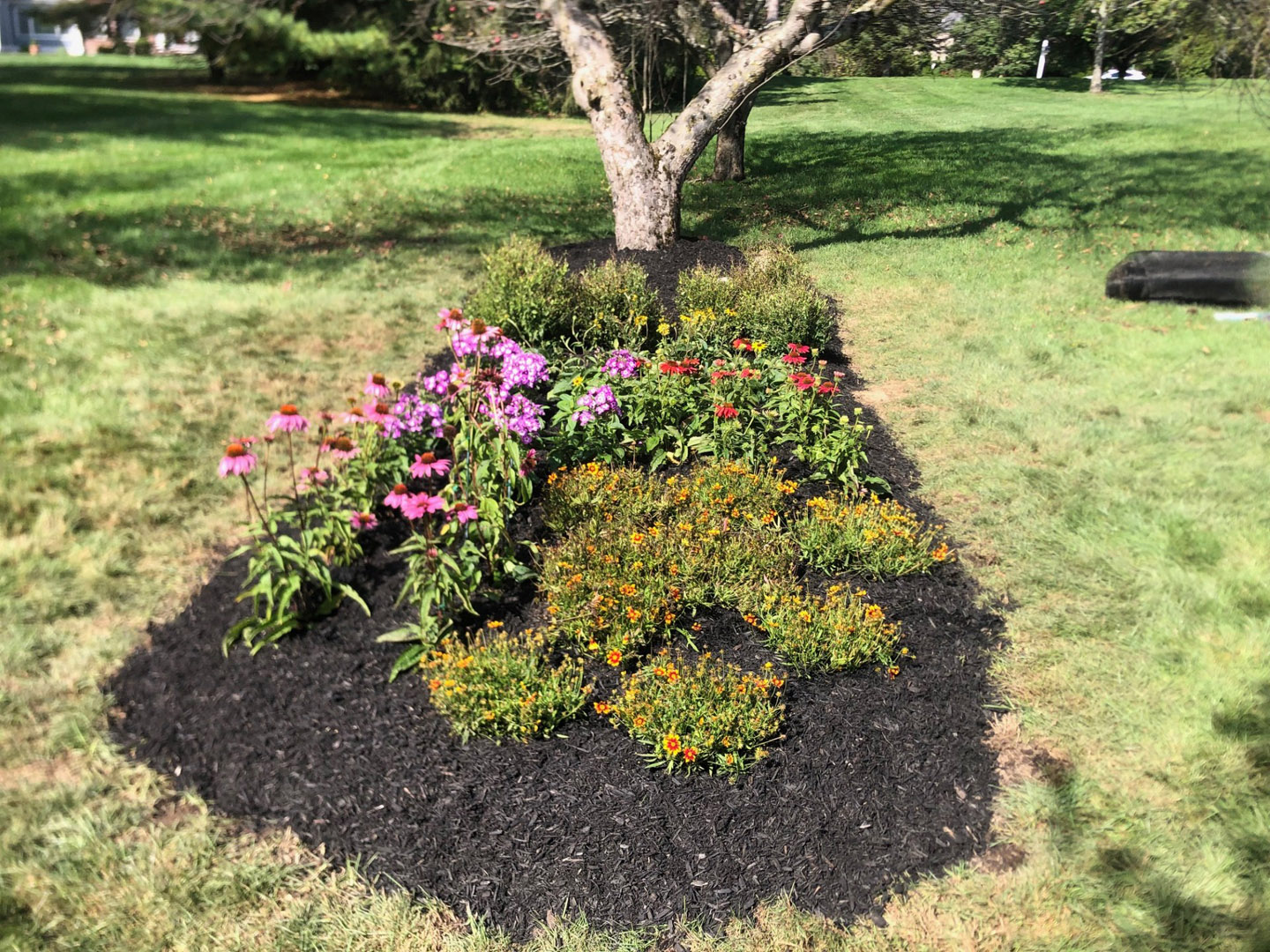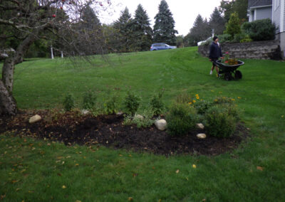 We reused the existing soil to fill a low spot in the nearby lawn, then installed 3 yards of fresh garden soil to provide moisture retention and a healthy foundation for the new plants.