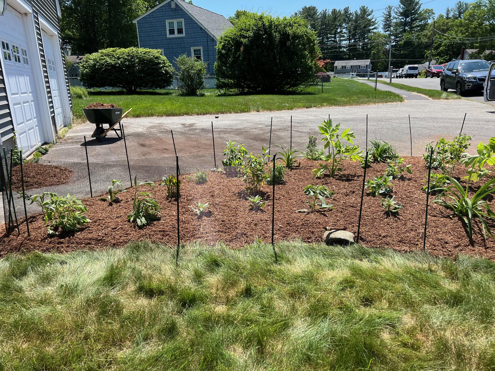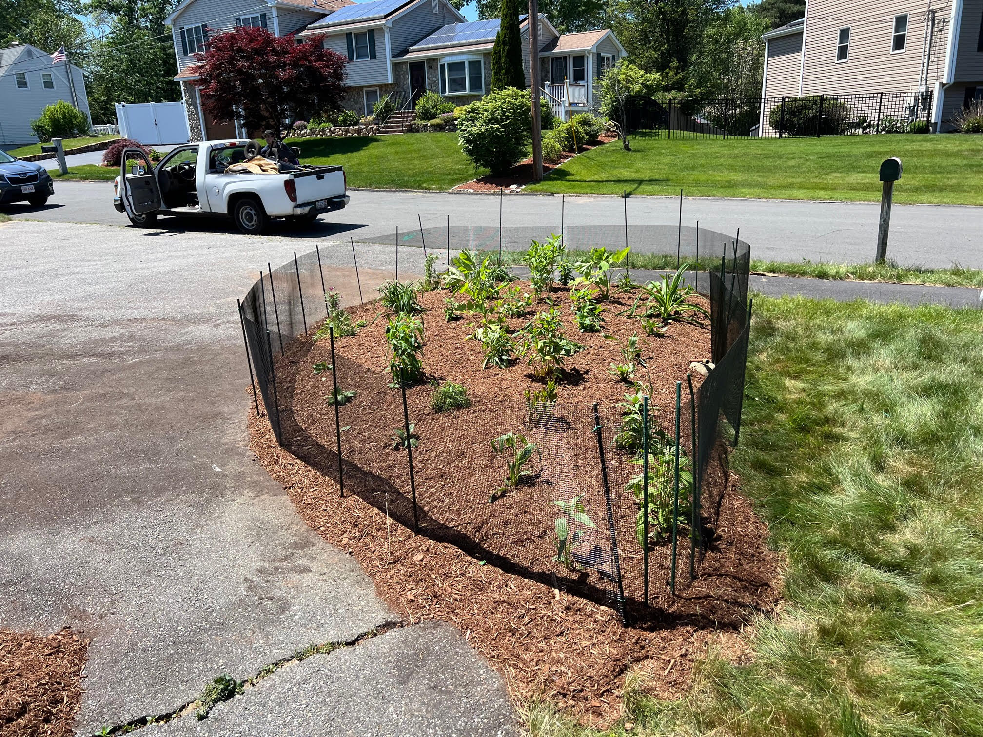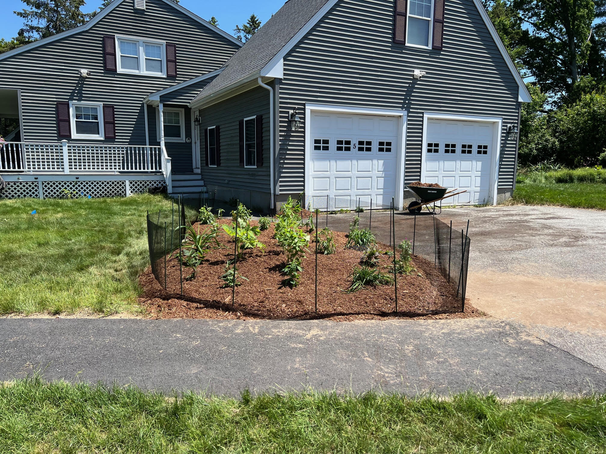 The Dingo made short work of removing the 7 yards of soil and then replacing it. The new 30 summer focused flowering perennials made the bunnies mad because the fence will keep them out!!