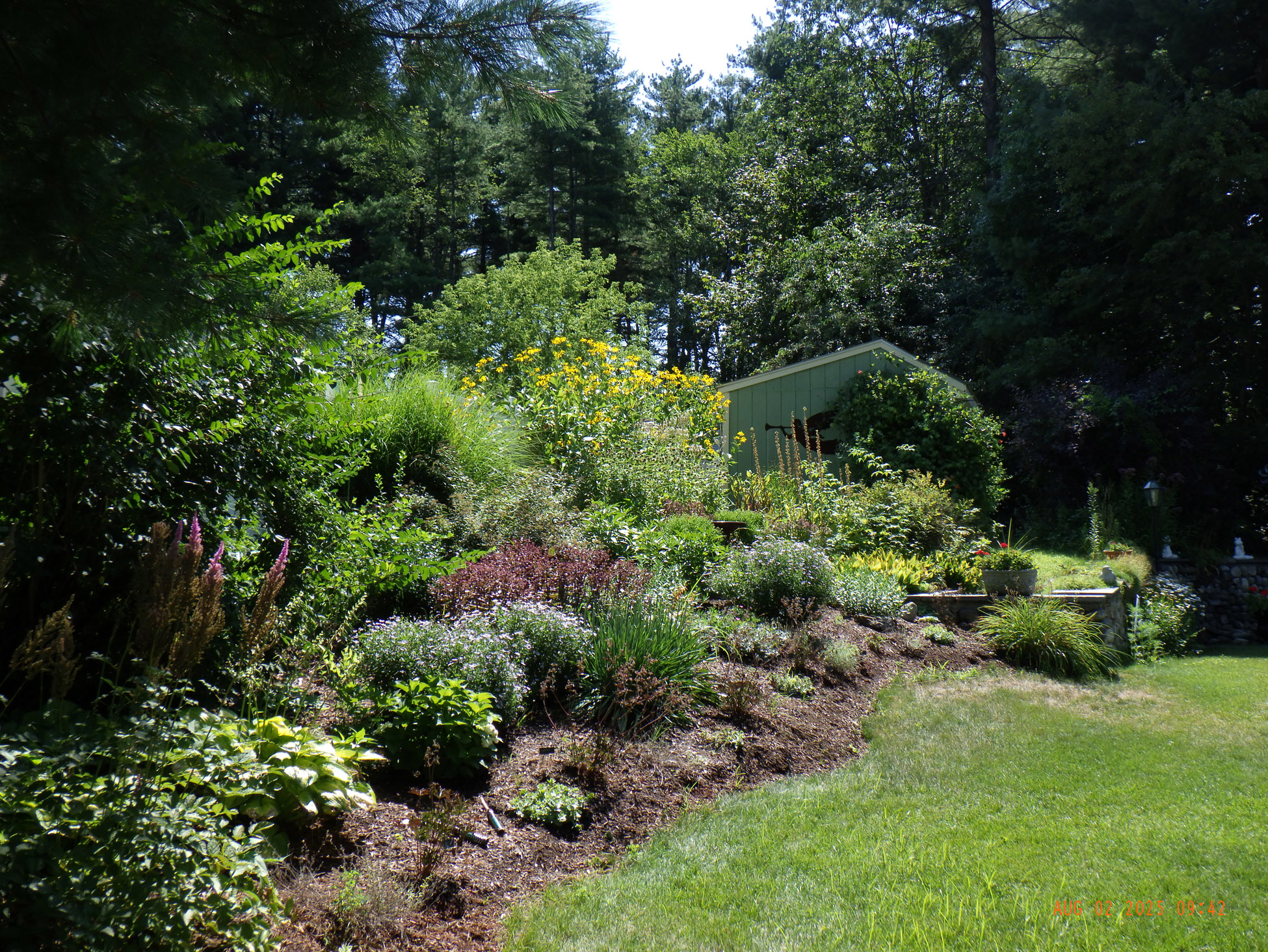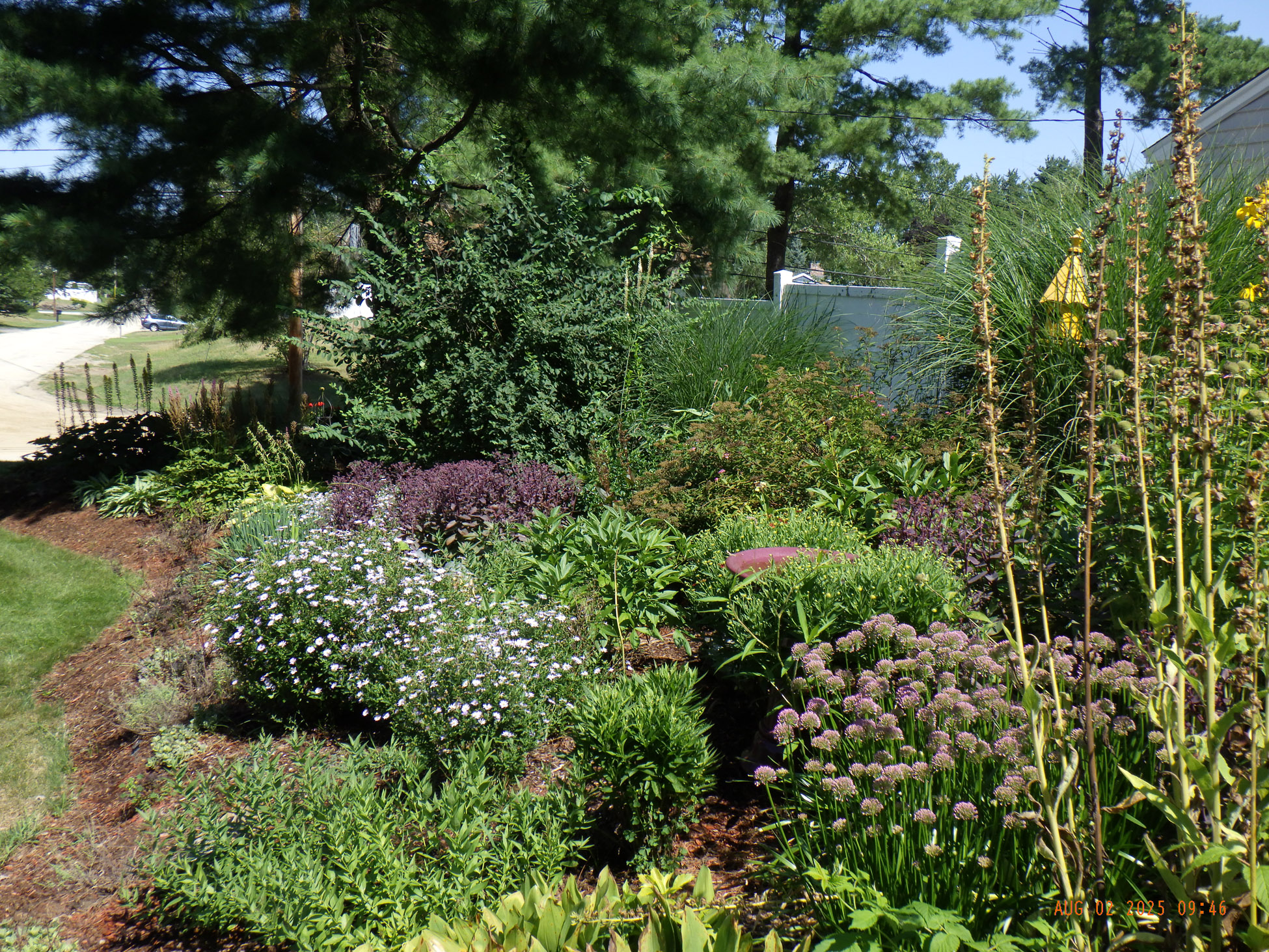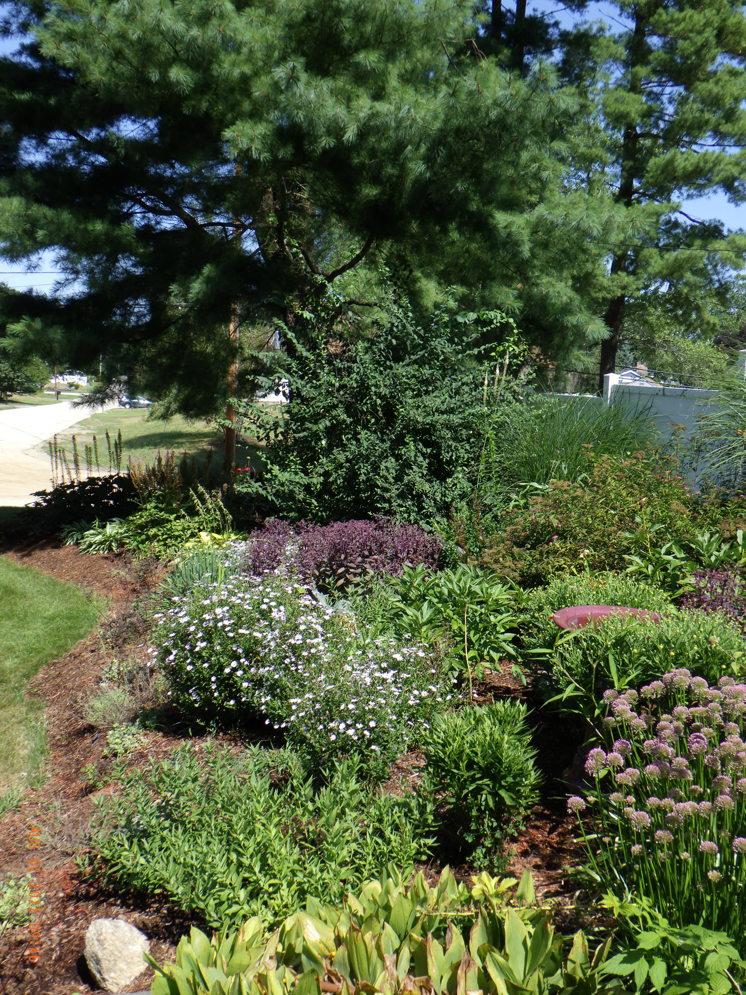 When I met with the client, they eagerly looked through my 3-inch-tall perennial album and picked their cherished plants. After they looked through the perennial photos, they asked to double the garden size because they wanted a Sun and Shade Experience. They chose to focus on open space and perennials that would be vibrant on a slope. On the first day of this garden project the crew pulled out all the unwanted plants and then the Dingo moved the 9 yards of Garden Soil up the hill. It was a 200-foot track on sheets of plywood. The soil was laid ten inches deep on the sun garden area and then to the lower shade garden. The sun garden has ninety perennials while the shade garden just required fifty perennials. The second day was a scorcher in early July, so we stopped planting at noon. On the third day the rest of the perennials were planted and we set up a drip irrigation system for each garden. Upon completion the client happily remarked “Yes that is what I envisioned.”