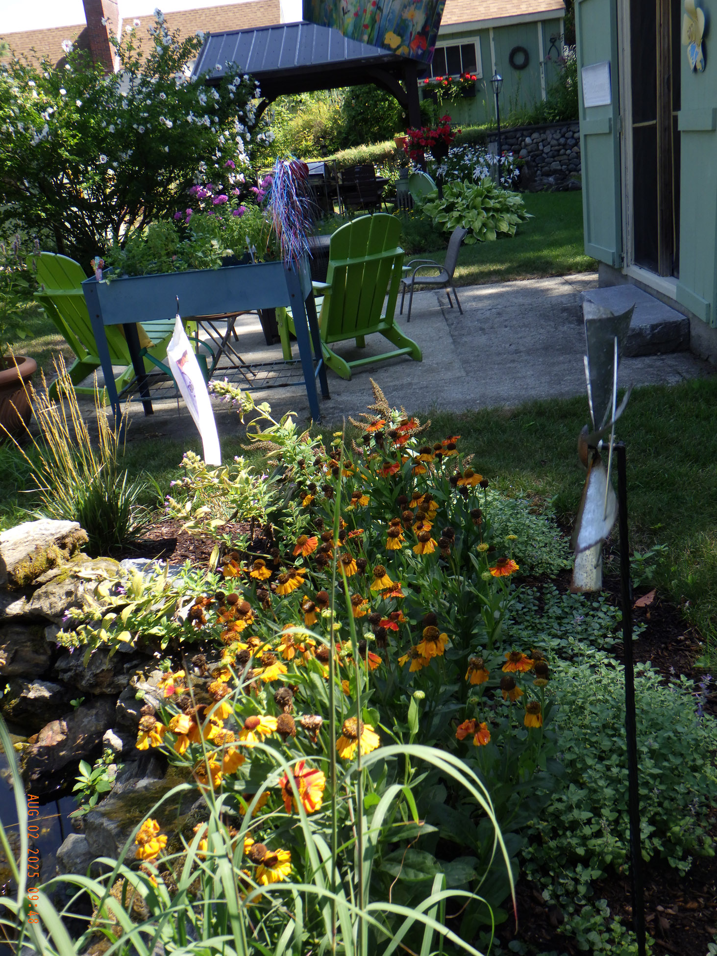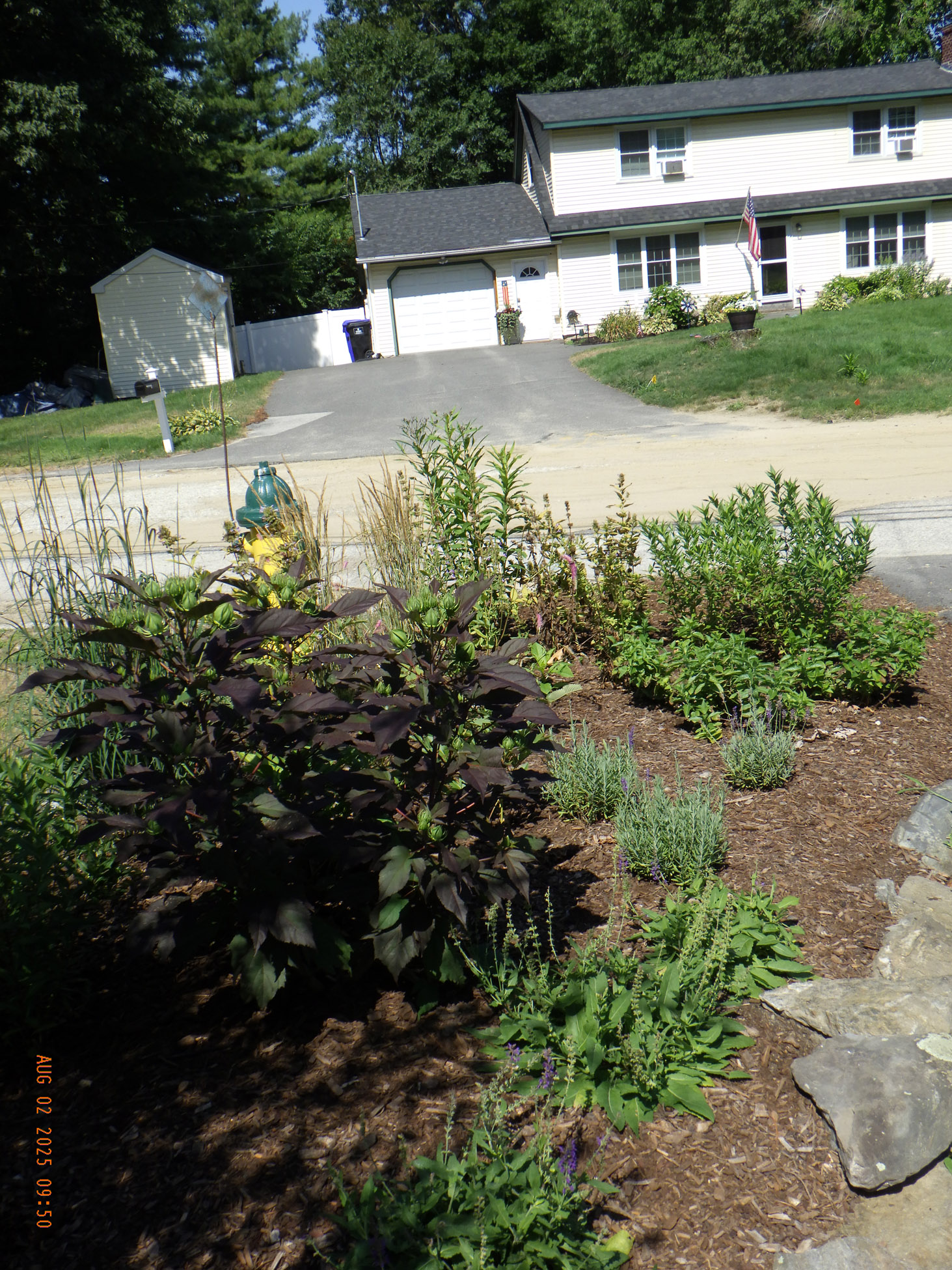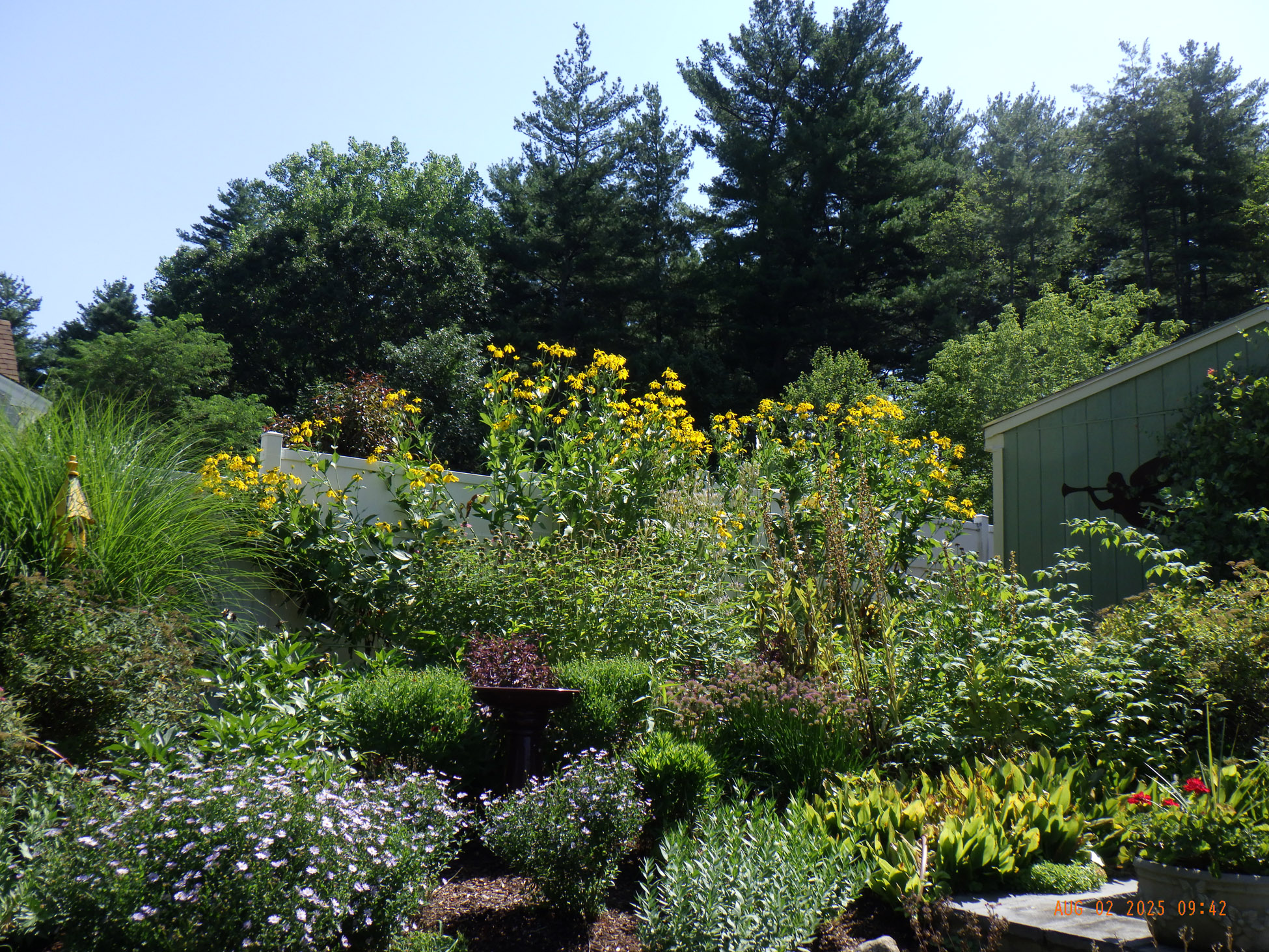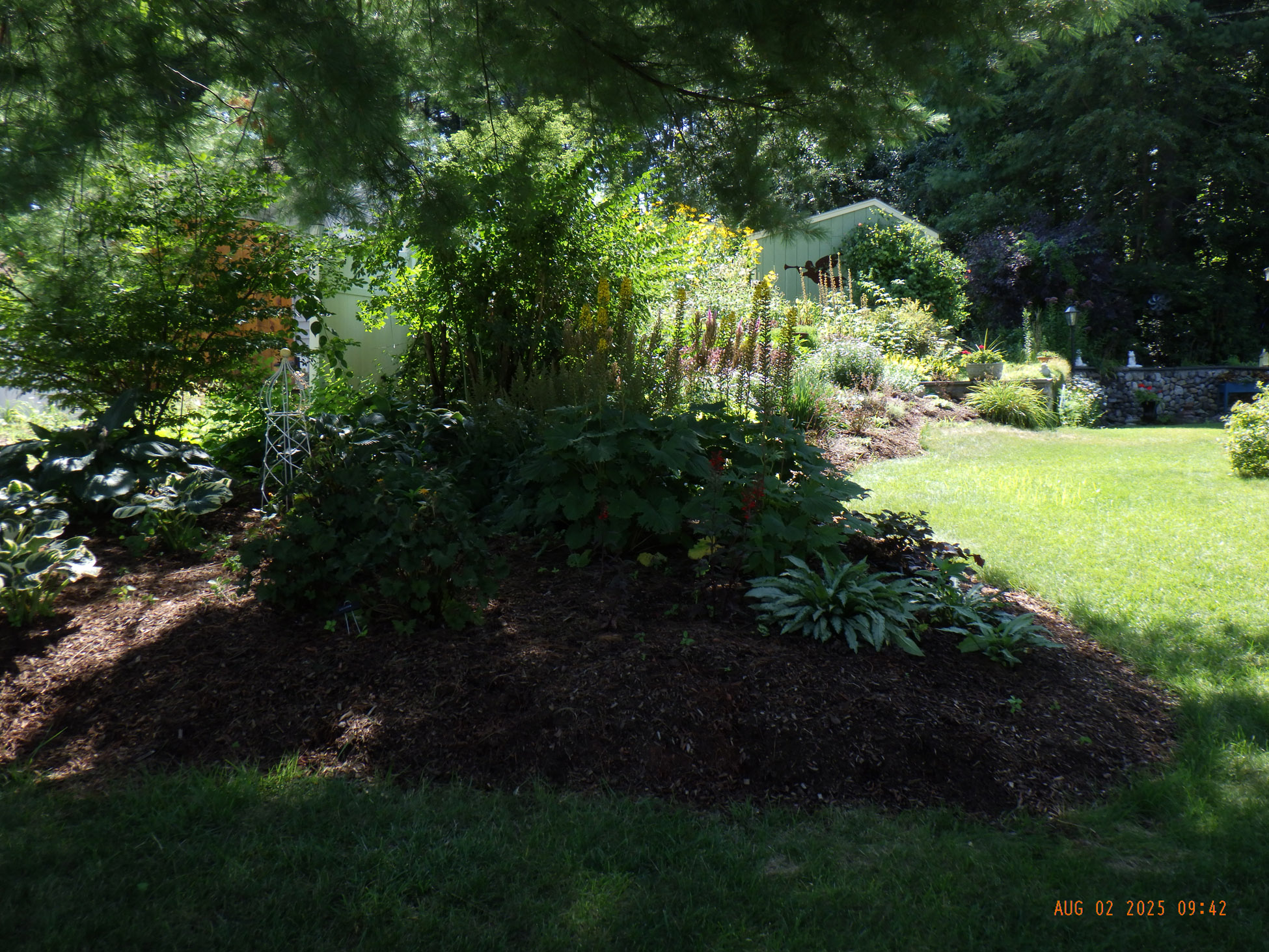 When I met with the client, they eagerly looked through my 3-inch-tall perennial album and picked their cherished plants. After they looked through the perennial photos, they asked to double the garden size because they wanted a Sun and Shade Experience. They chose to focus on open space and perennials that would be vibrant on a slope. On the first day of this garden project the crew pulled out all the unwanted plants and then the Dingo moved the 9 yards of Garden Soil up the hill. It was a 200-foot track on sheets of plywood. The soil was laid ten inches deep on the sun garden area and then to the lower shade garden. The sun garden has ninety perennials while the shade garden just required fifty perennials. The second day was a scorcher in early July, so we stopped planting at noon. On the third day the rest of the perennials were planted and we set up a drip irrigation system for each garden. Upon completion the client happily remarked “Yes that is what I envisioned.”