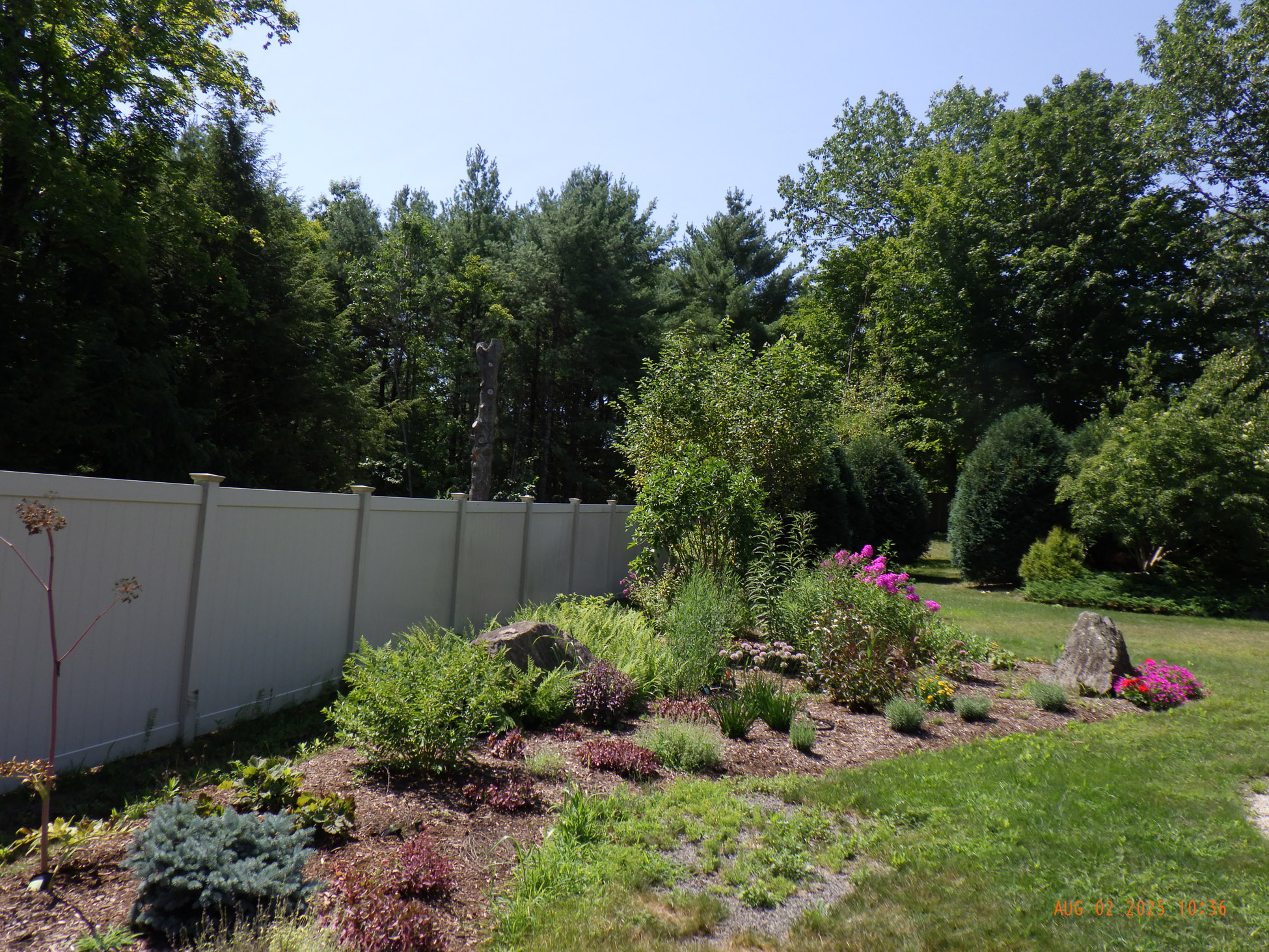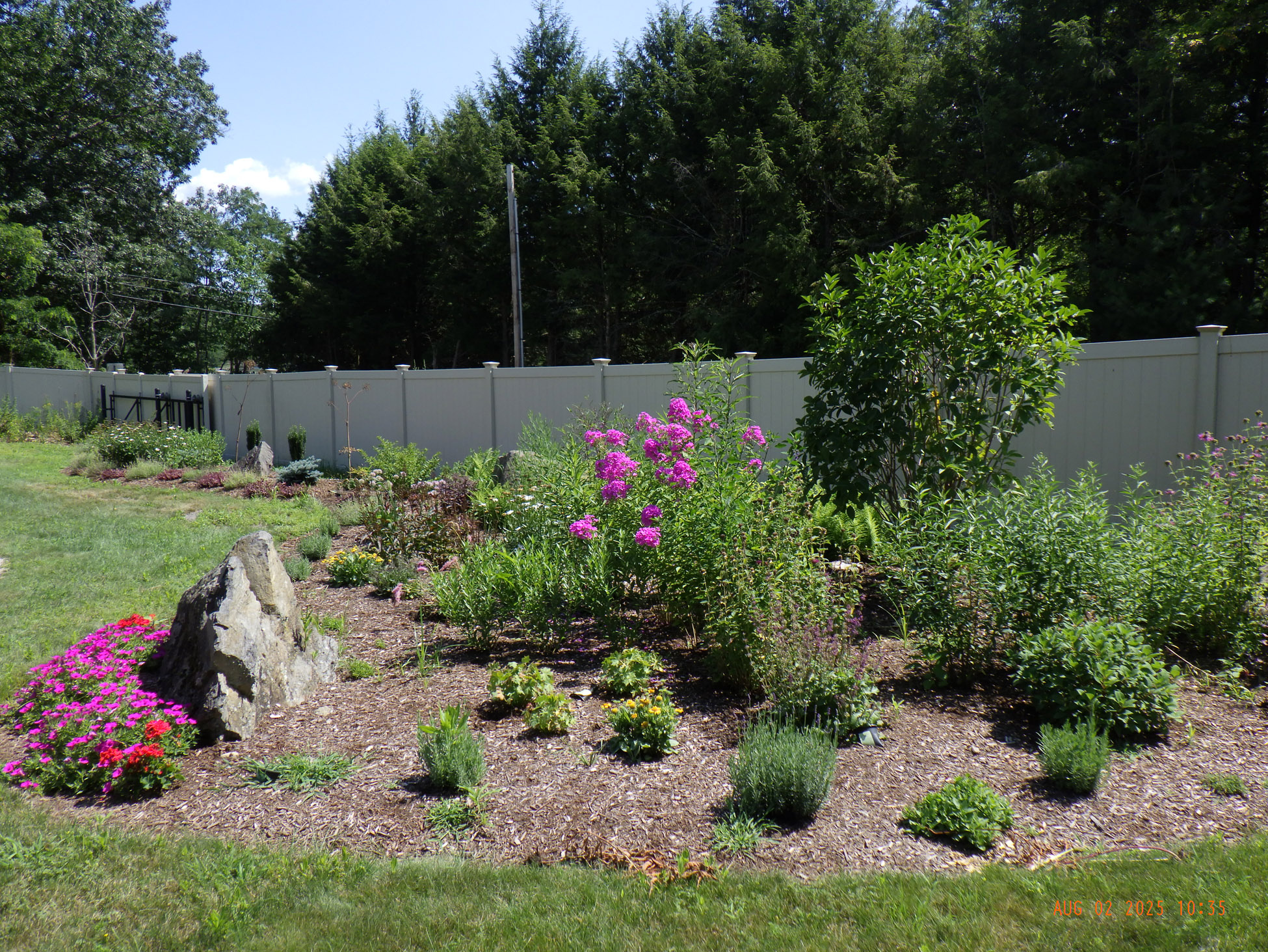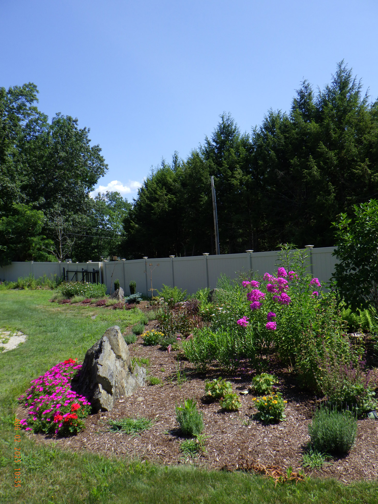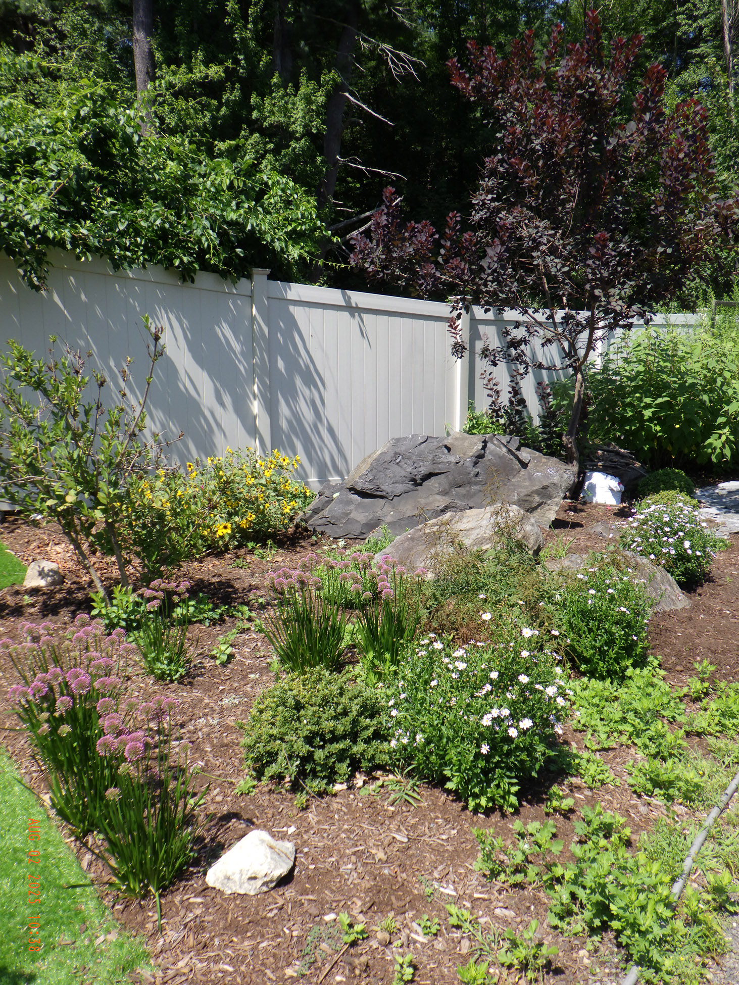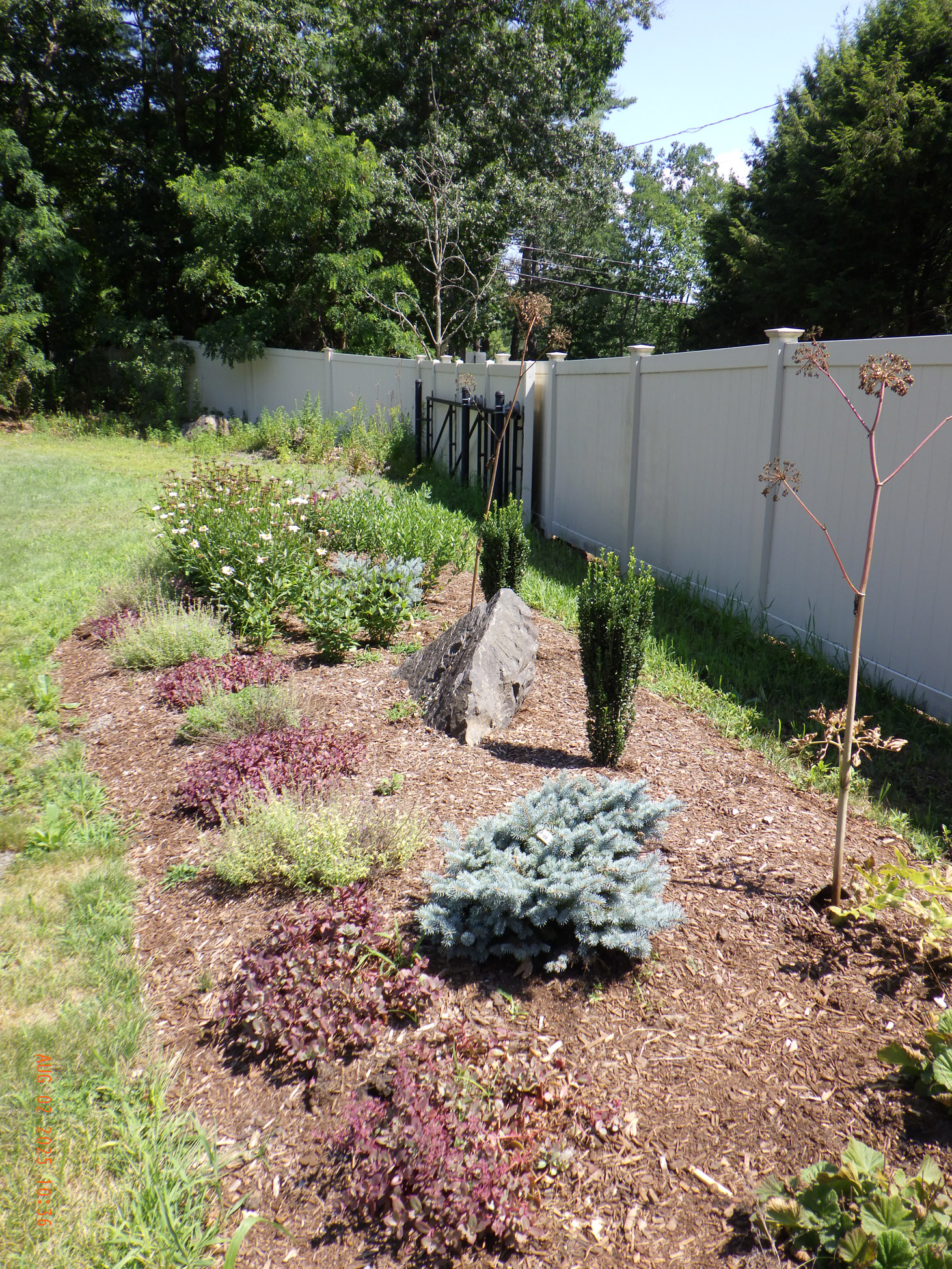 This garden savvy client’s beloved gardens were overwhelmed with weeds. The weeds were so invasive from the neighbors that he wanted a path next to the white plastic fence for the lawnmower to keep the weeds away from the revitalized gardens. I suggested for the crew to weed and then while weeding we can create a design as the garden soil appeared. For the first day the 2 crew members weeded. As the space became visible the clients chose their new perennials and shrubs. Several days later the perennials arrived and the crew began installing them. The client asked for a Fringe Tree and Magnolia. So off I went to locate them. Sure, enough I found 2 lovely specimens at Weston Nursery in Chelmsford. Yes, those two really made the garden come to life. With 5 – 6 inches of new soil laid down 196 perennials and 10 shrubs the garden had new life and the transformation was intense