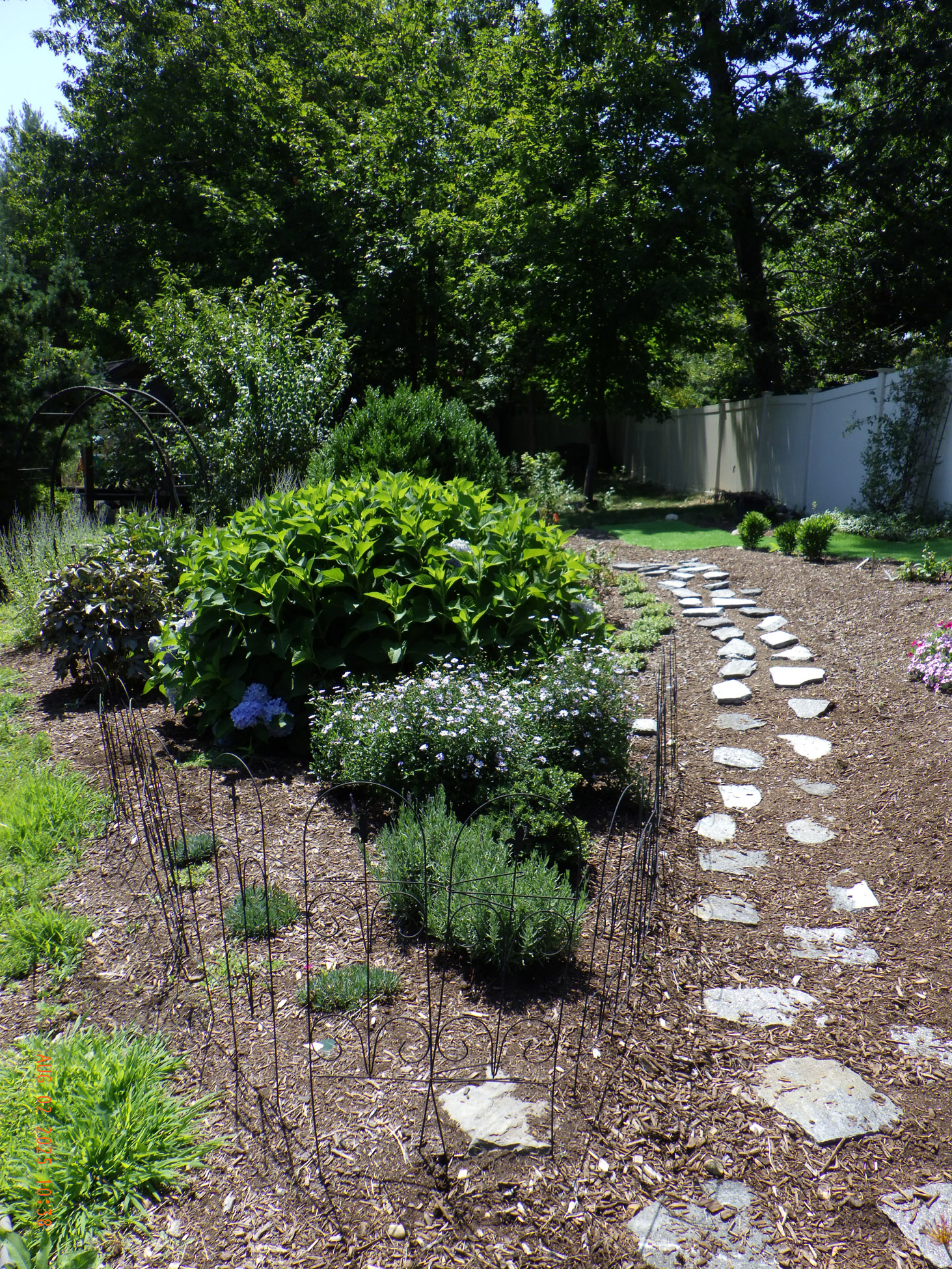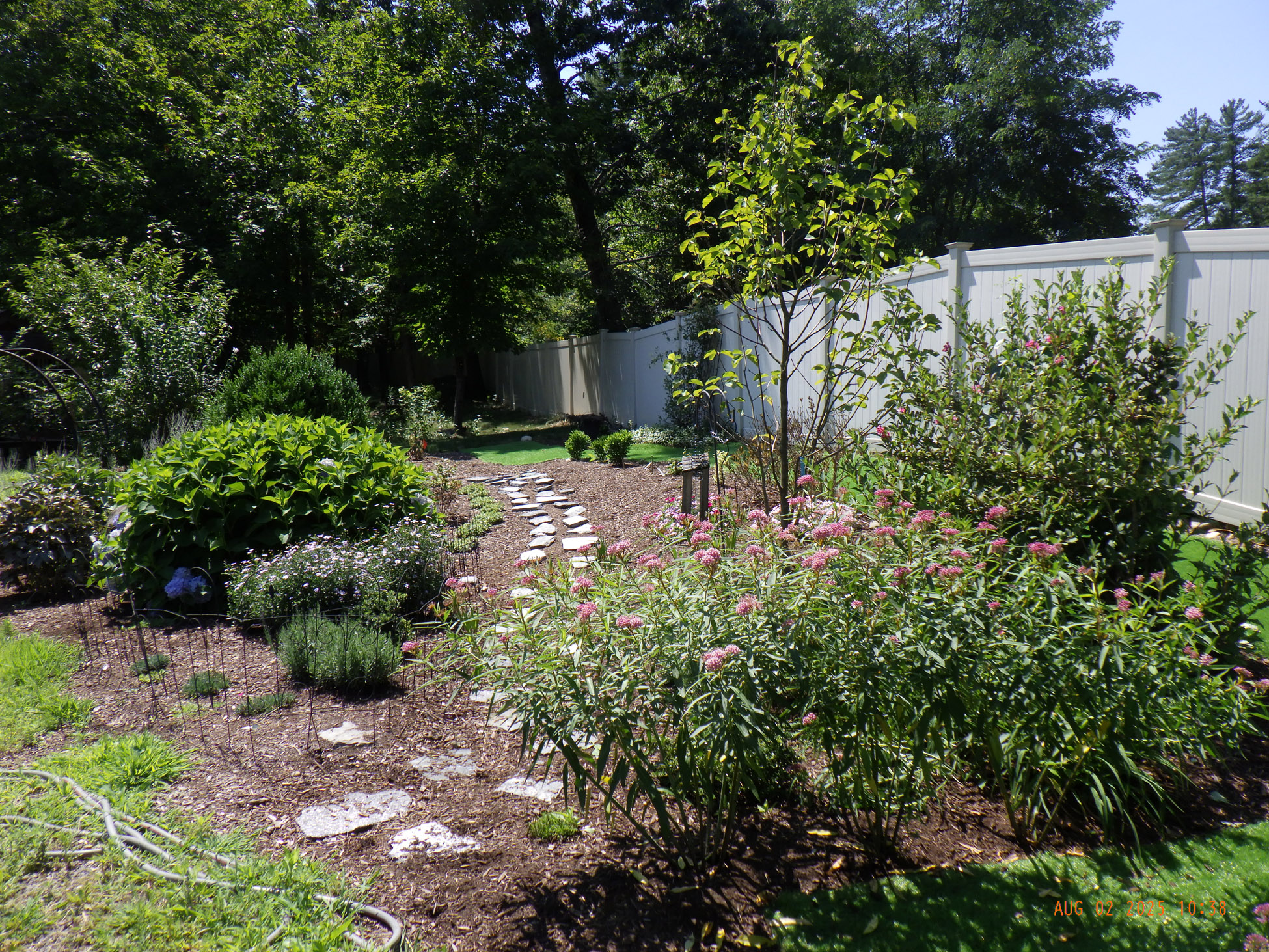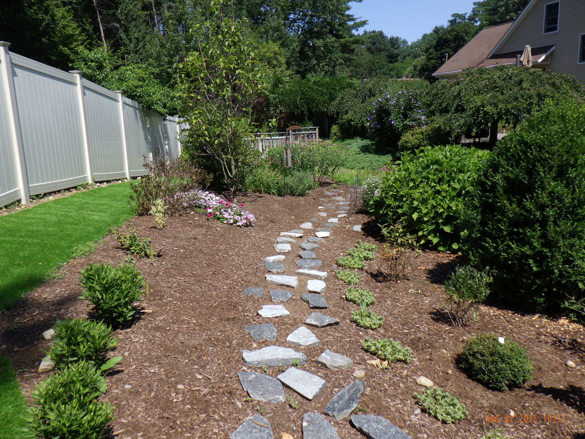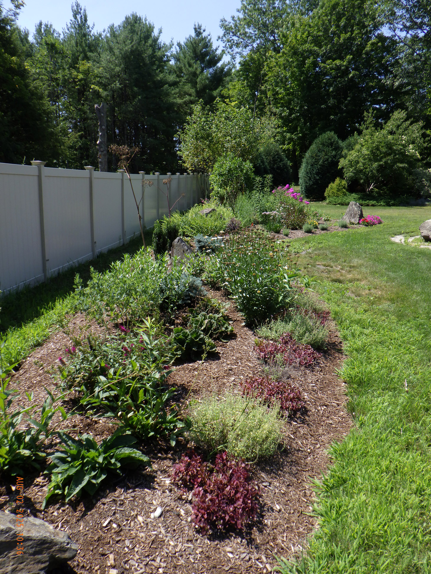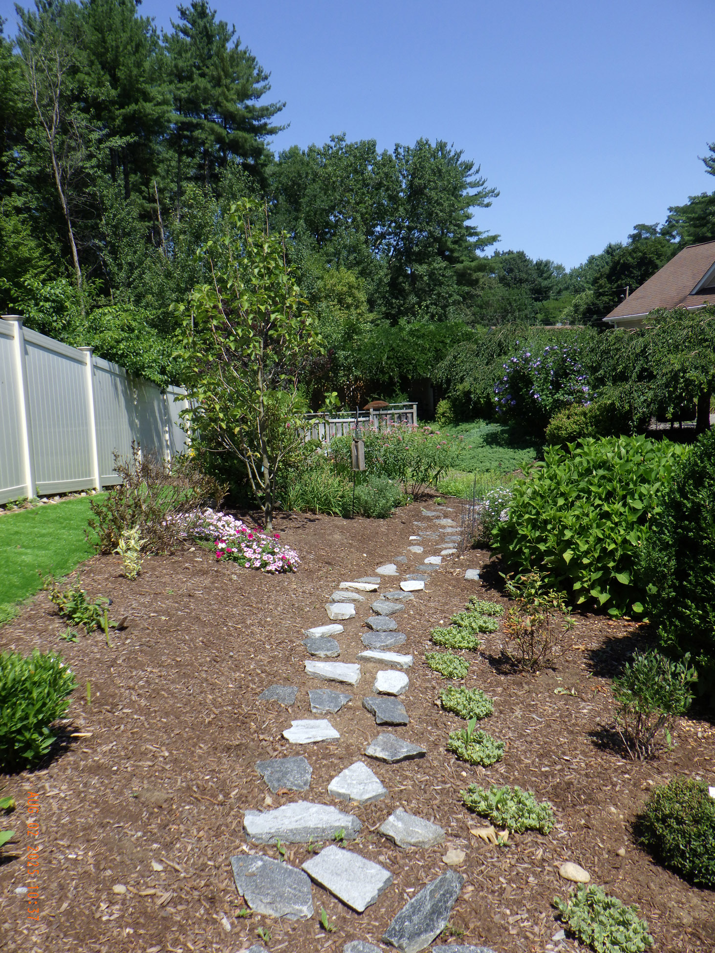 This garden savvy client’s beloved gardens were overwhelmed with weeds. The weeds were so invasive from the neighbors that he wanted a path next to the white plastic fence for the lawnmower to keep the weeds away from the revitalized gardens. I suggested for the crew to weed and then while weeding we can create a design as the garden soil appeared. For the first day the 2 crew members weeded. As the space became visible the clients chose their new perennials and shrubs. Several days later the perennials arrived and the crew began installing them. The client asked for a Fringe Tree and Magnolia. So off I went to locate them. Sure, enough I found 2 lovely specimens at Weston Nursery in Chelmsford. Yes, those two really made the garden come to life. With 5 – 6 inches of new soil laid down 196 perennials and 10 shrubs the garden had new life and the transformation was intense