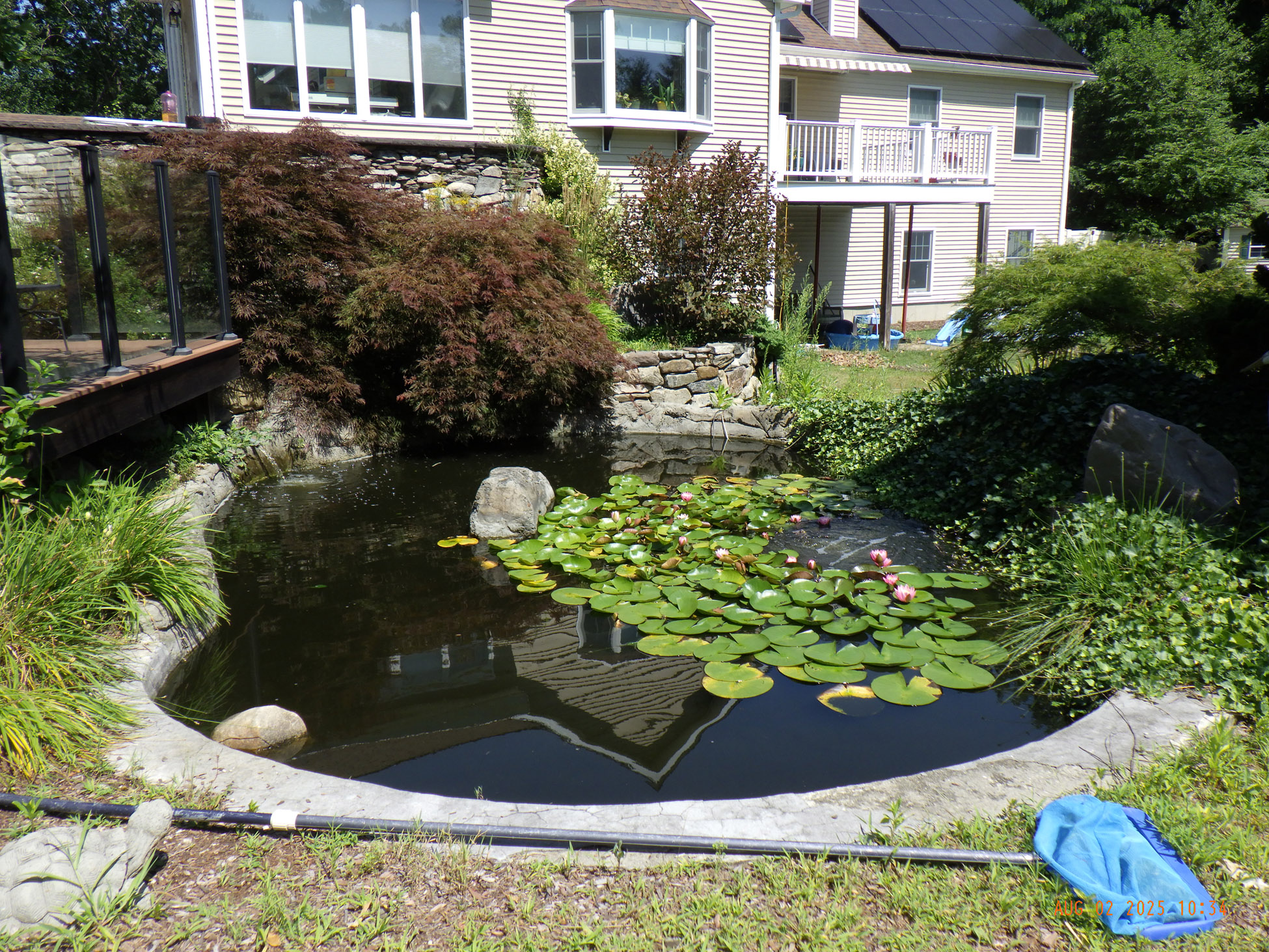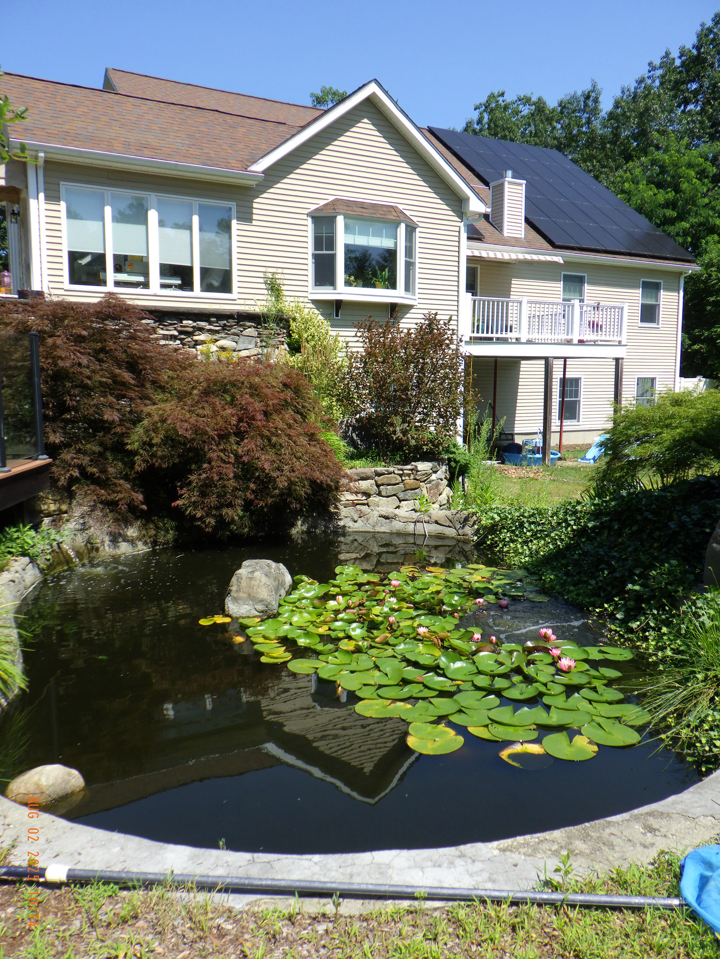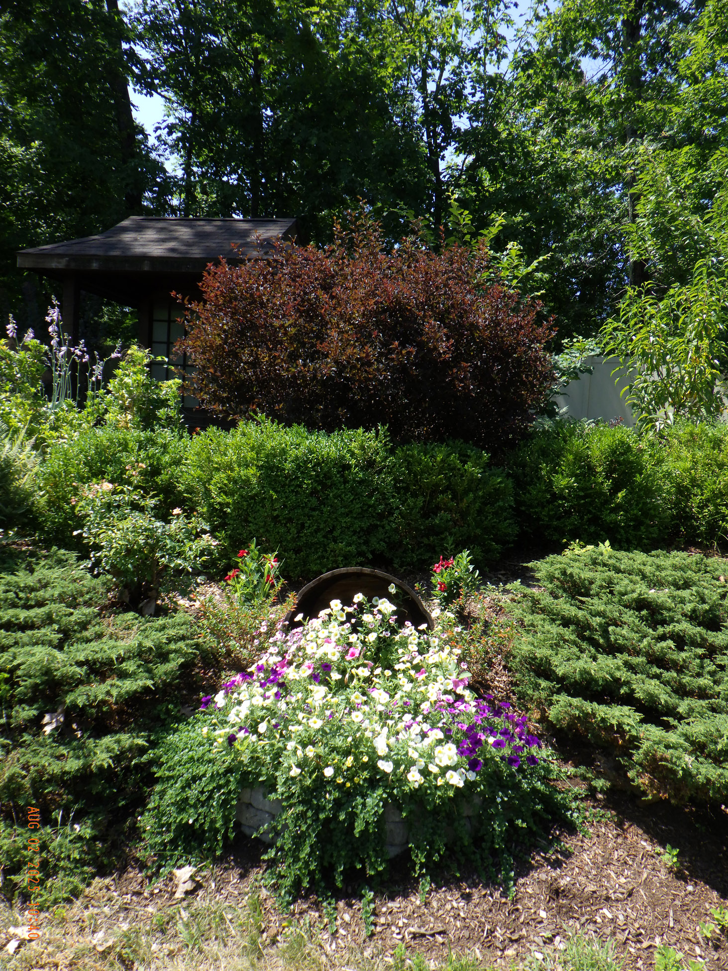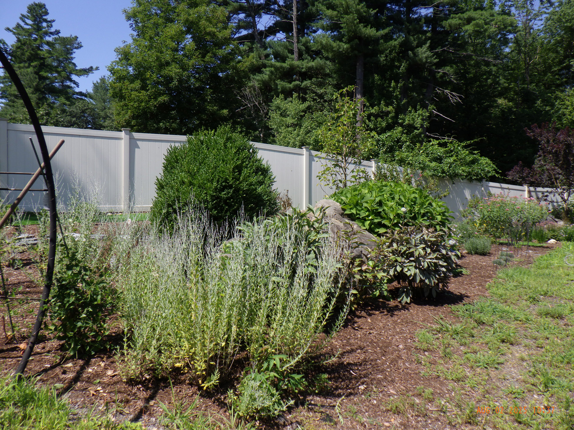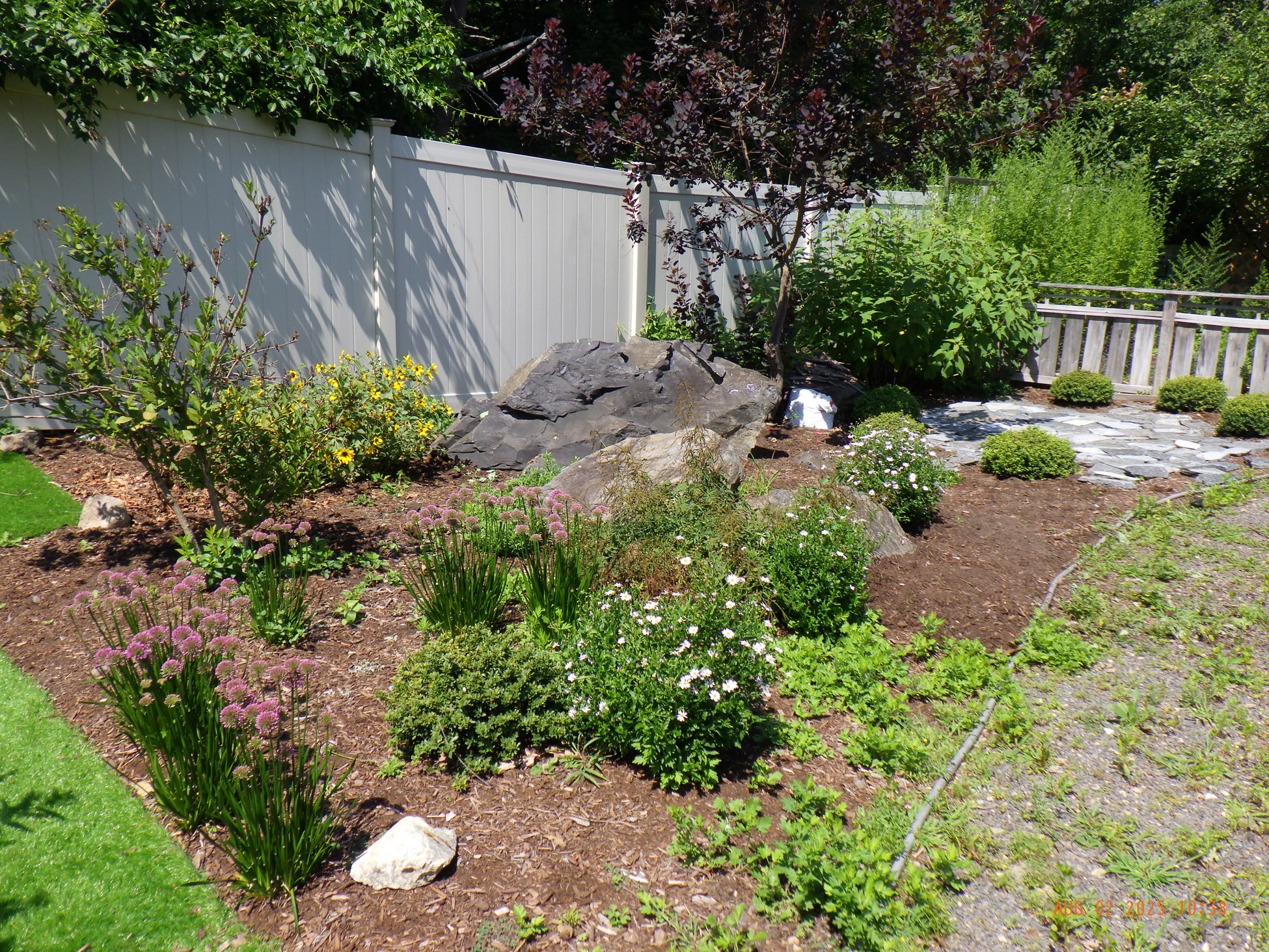 This garden savvy client’s beloved gardens were overwhelmed with weeds. The weeds were so invasive from the neighbors that he wanted a path next to the white plastic fence for the lawnmower to keep the weeds away from the revitalized gardens. I suggested for the crew to weed and then while weeding we can create a design as the garden soil appeared. For the first day the 2 crew members weeded. As the space became visible the clients chose their new perennials and shrubs. Several days later the perennials arrived and the crew began installing them. The client asked for a Fringe Tree and Magnolia. So off I went to locate them. Sure, enough I found 2 lovely specimens at Weston Nursery in Chelmsford. Yes, those two really made the garden come to life. With 5 – 6 inches of new soil laid down 196 perennials and 10 shrubs the garden had new life and the transformation was intense