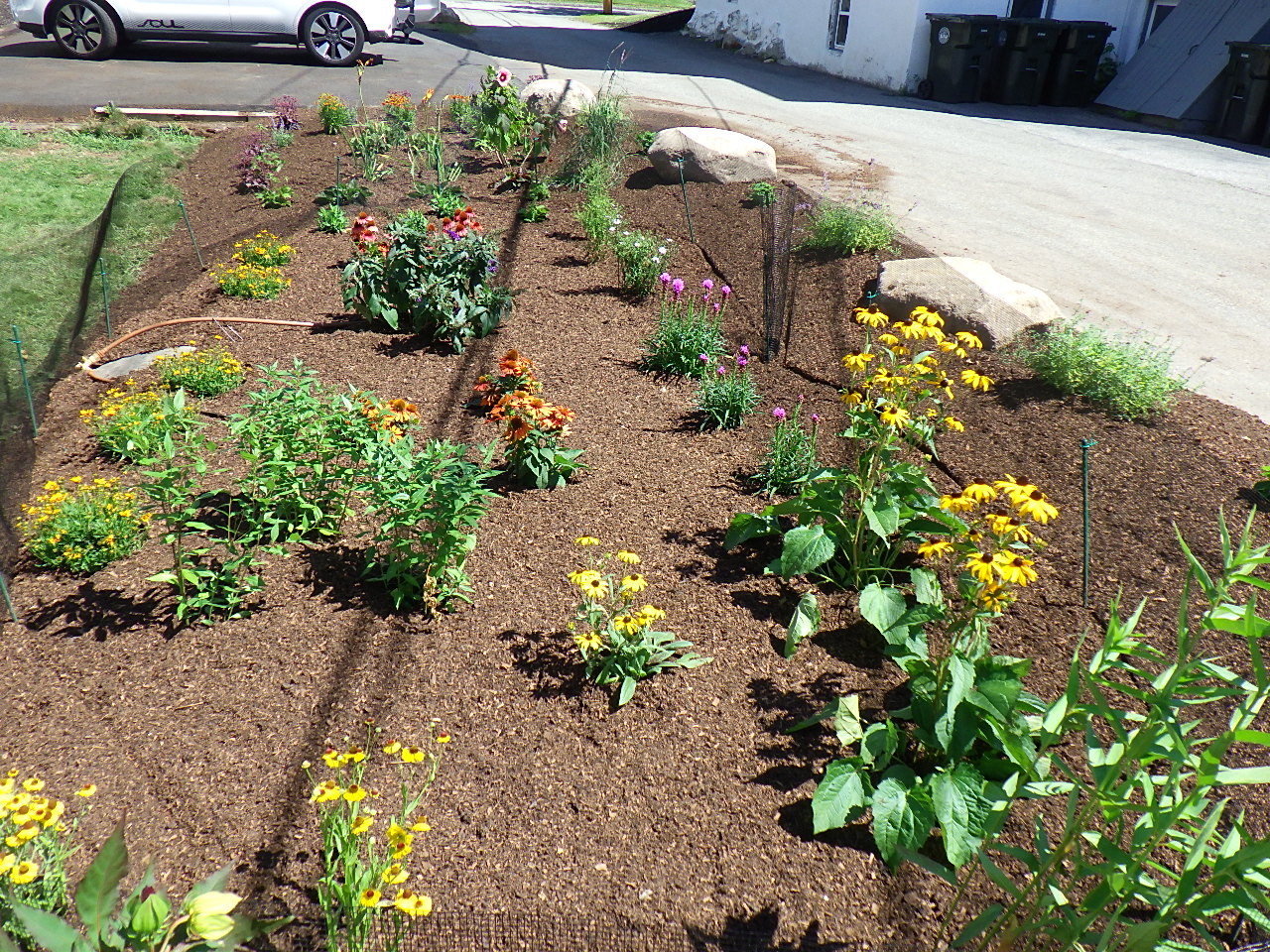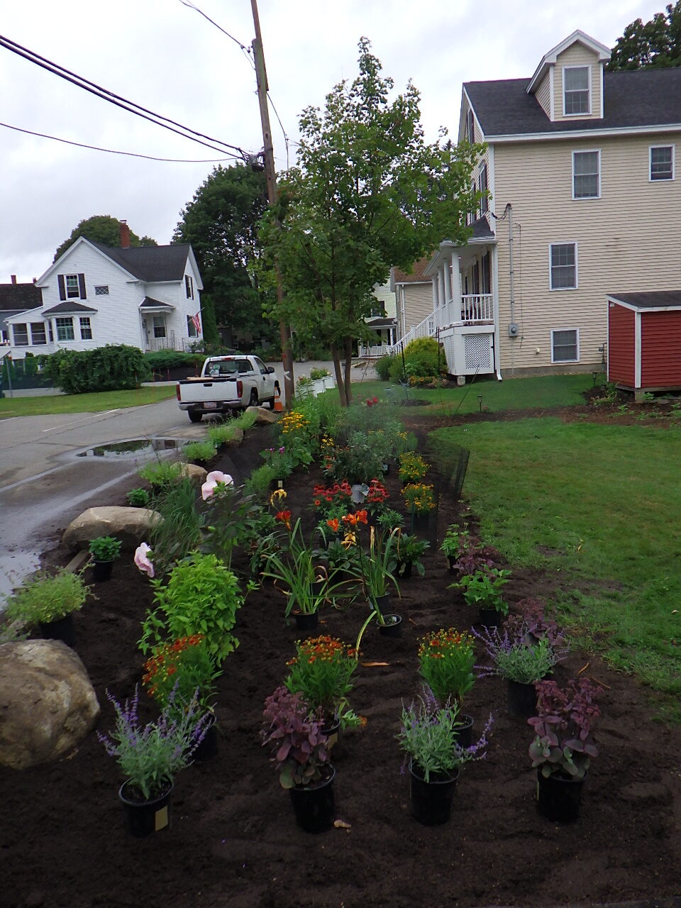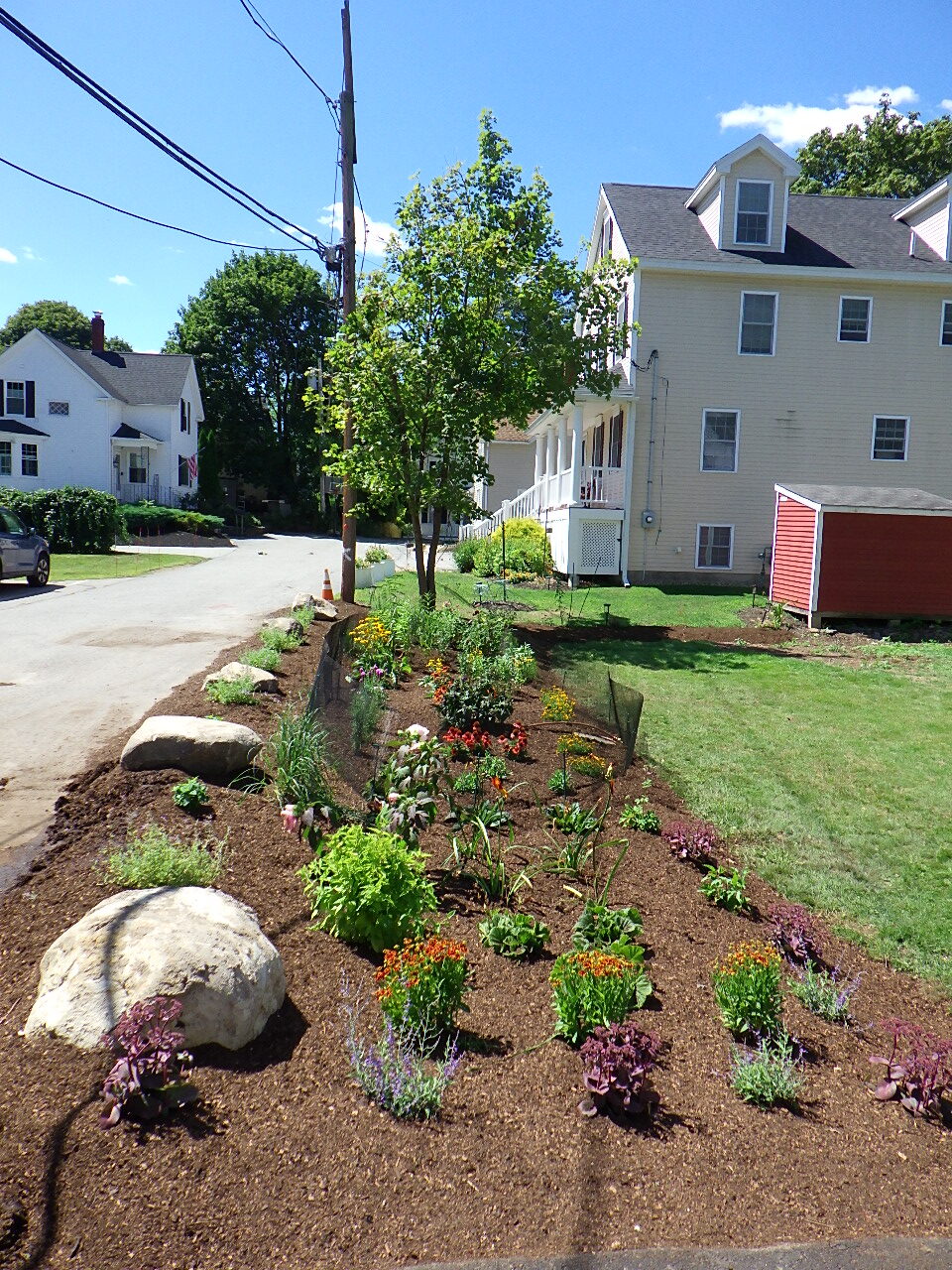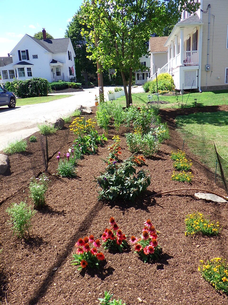 We installed 90 sun-loving perennials, carefully selected to thrive in Andover’s climate. The garden’s central focus features a breathtaking display of Coneflowers, Black-Eyed Susans, Coreopsis, and Asters. These vibrant blooms bring summer magic with their happy, colorful hues. To protect the plants from local wildlife, half of the perennials were installed with fence protection to keep bunnies at bay.