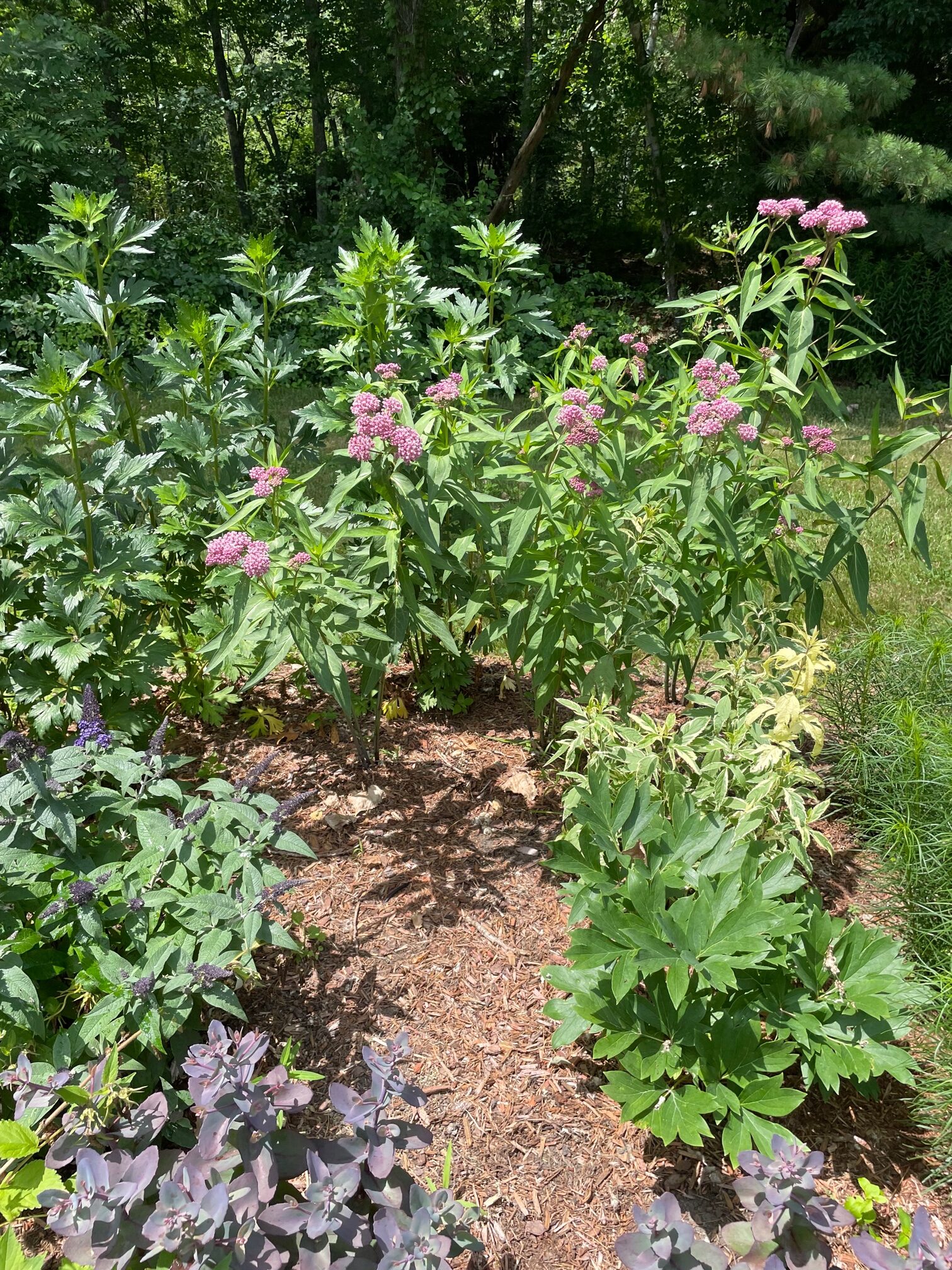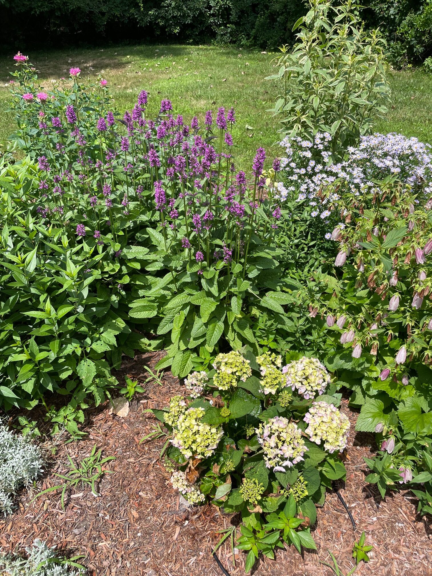 The client was thrilled with the result! In September, during my return visit, she shared, “My husband spends more time on the bench than I do.” I replied, “Yeah!! We have a convert to the love of purples!”—a testament to the garden’s charm.