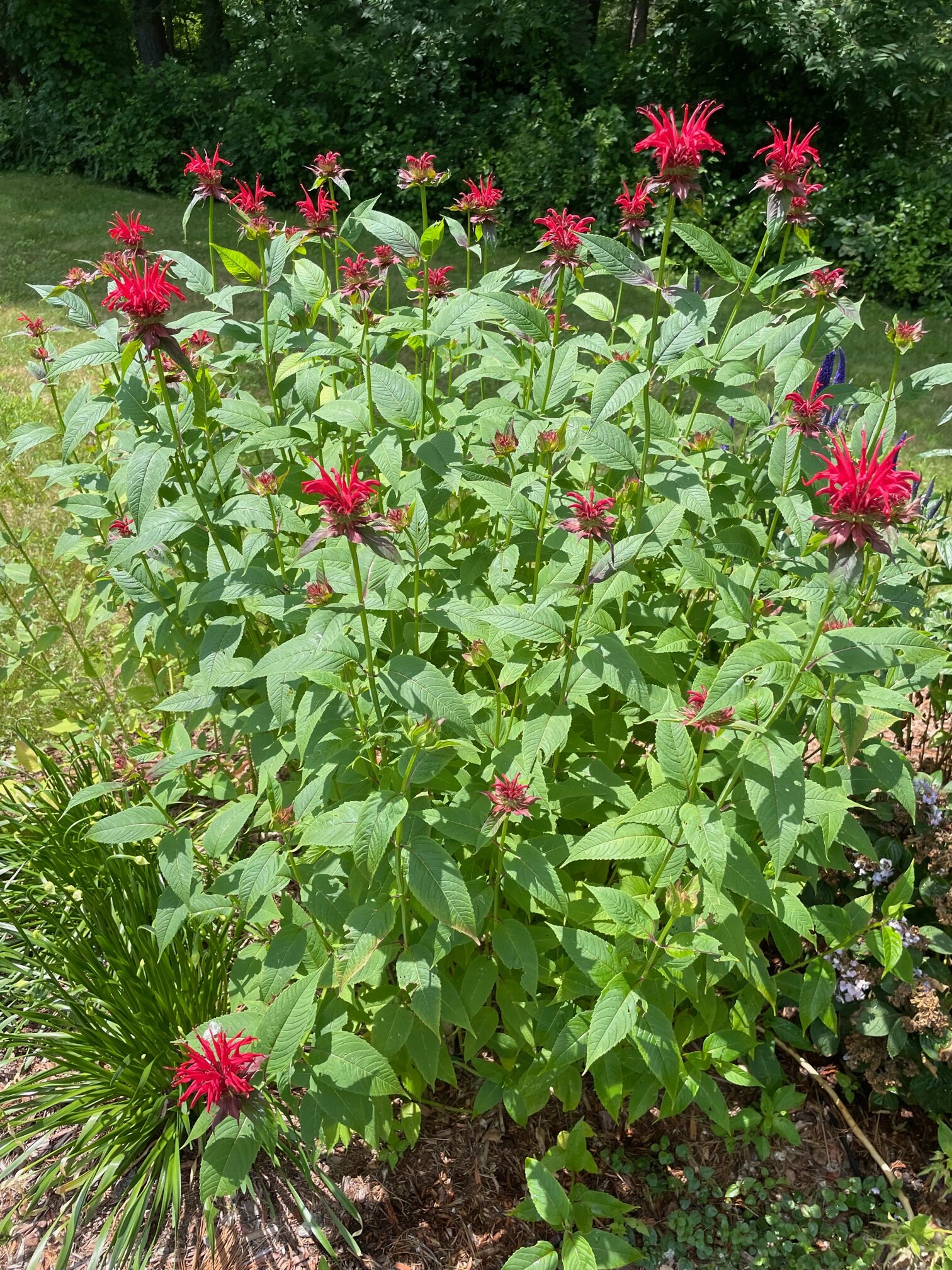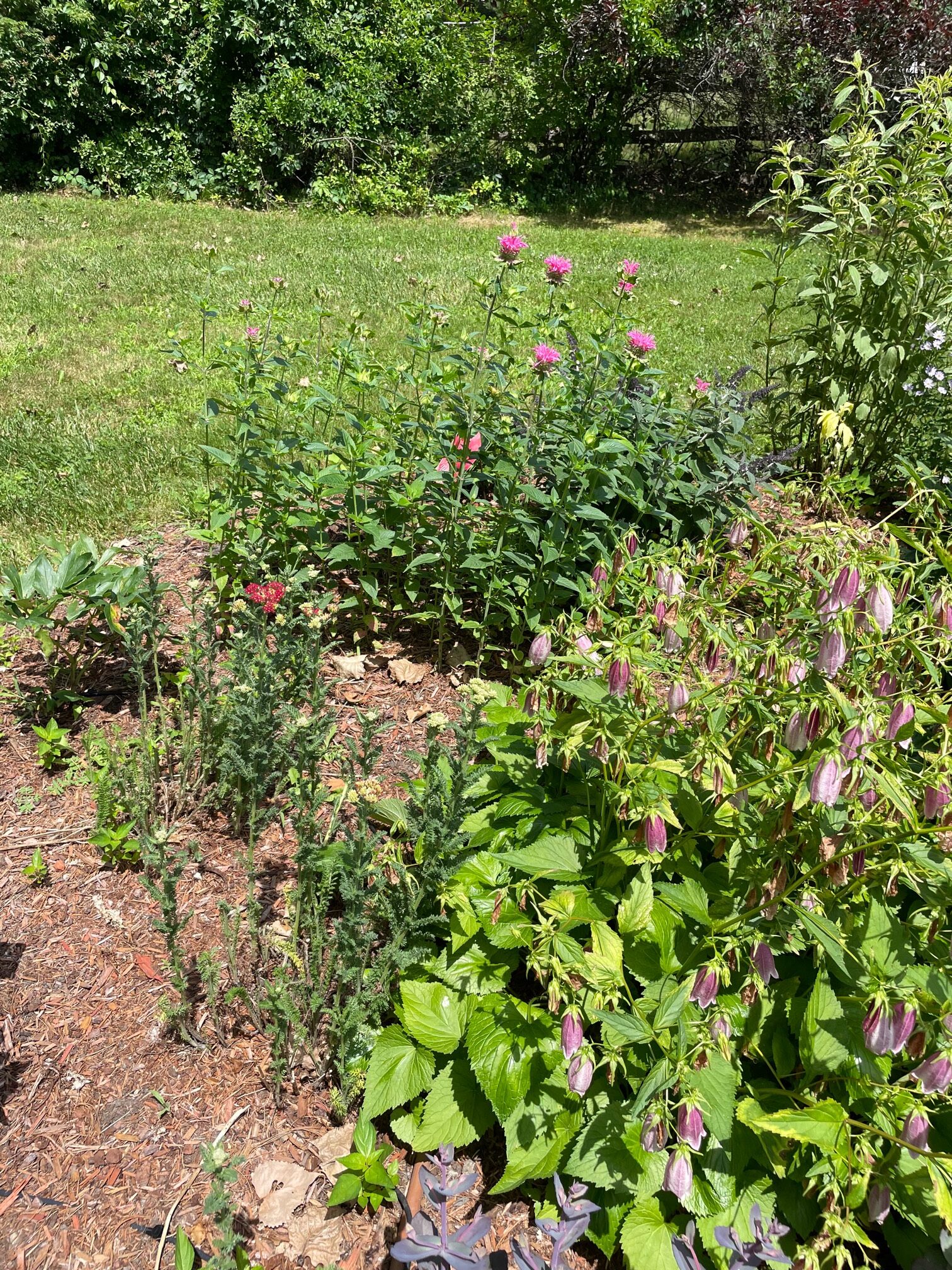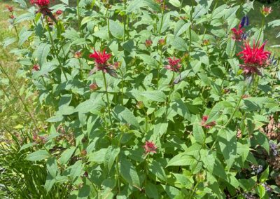 Over two days in early July, our crew installed 84 perennials and 4 shrubs, using 10 yards of soil and 2 yards of mulch. We crafted a unique bowtie-shaped design, incorporating the client’s provided bench and adding irrigation for easy maintenance.