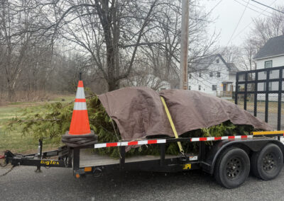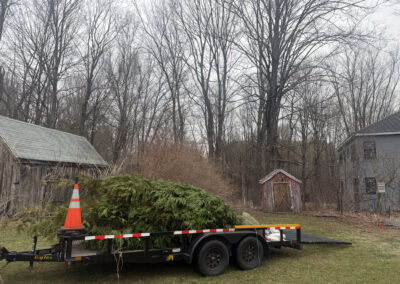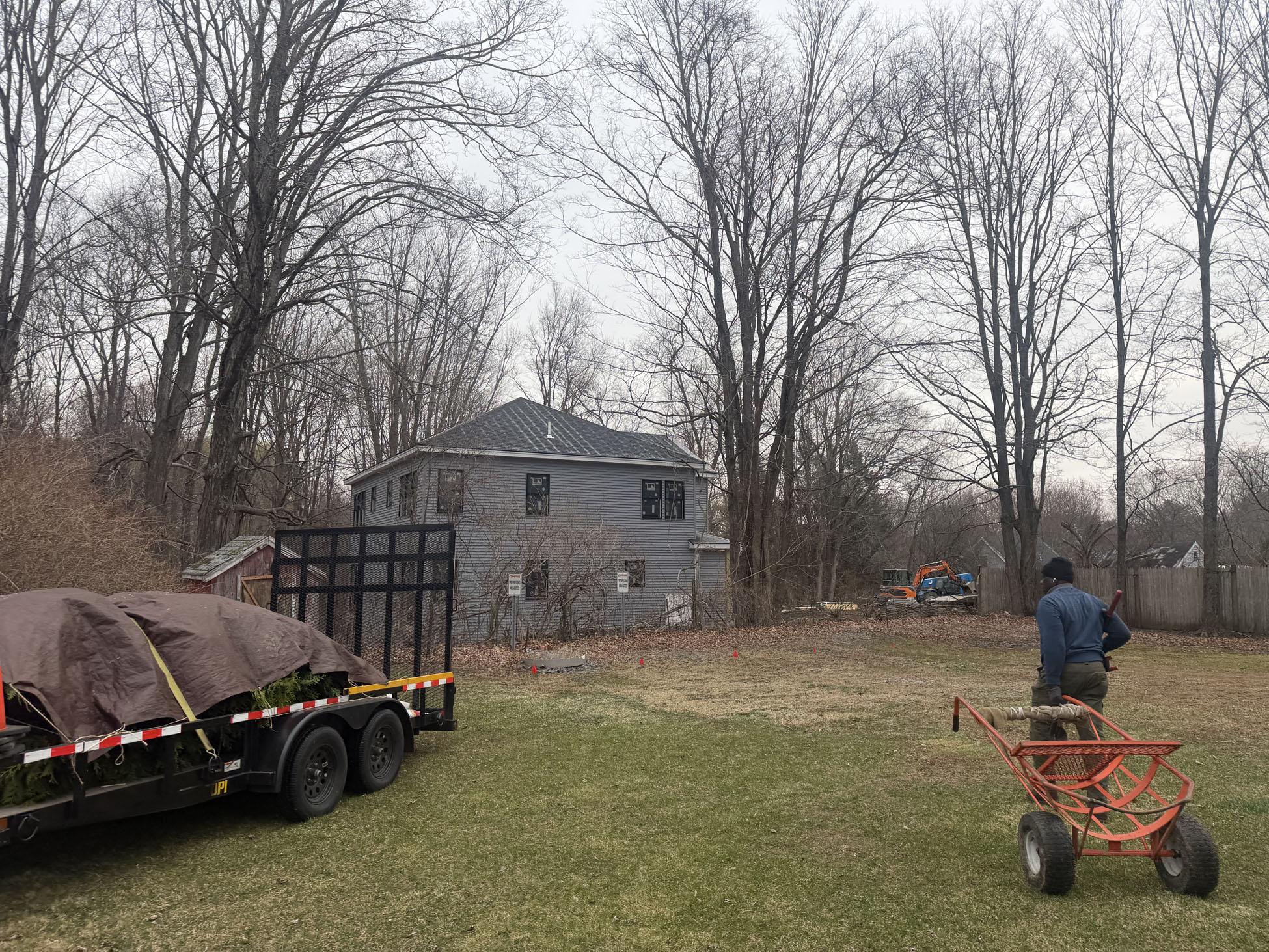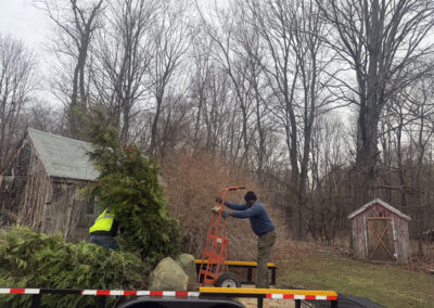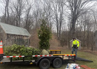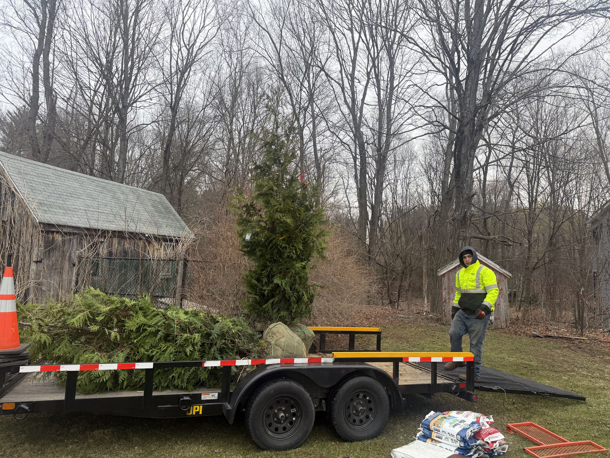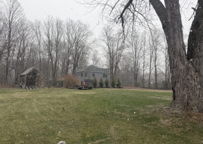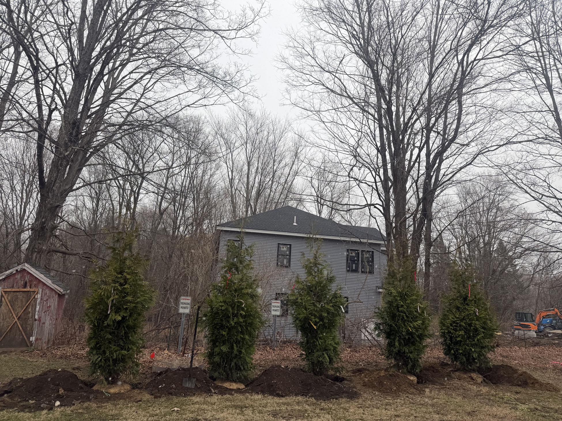 On planting day, the crew from Greenleaf’s Garden Design arrived ready to go. Using our Dingo auger, we efficiently handled the large root balls while working right through passing snow squalls—digging, setting, and backfilling each tree with precision.
