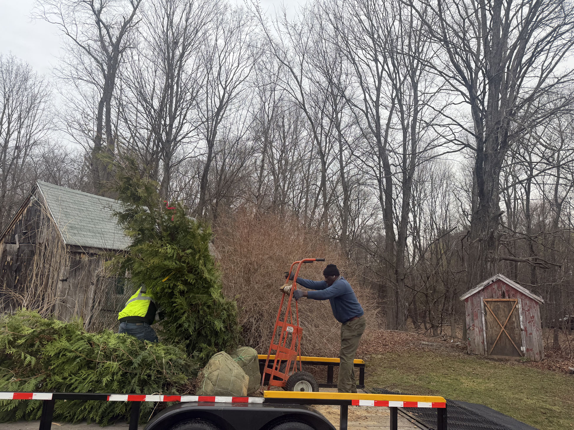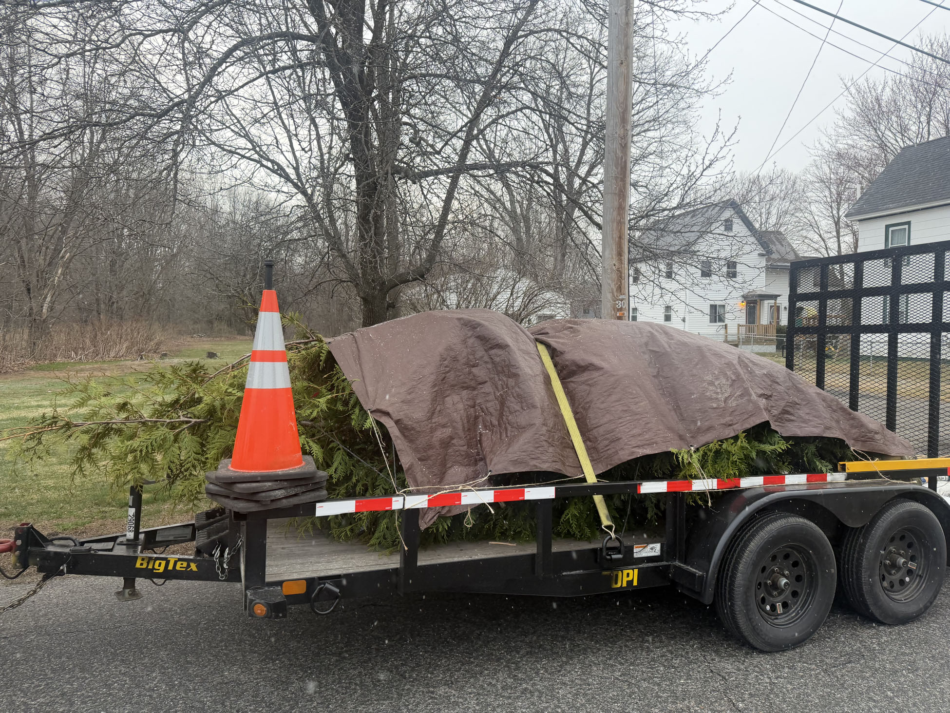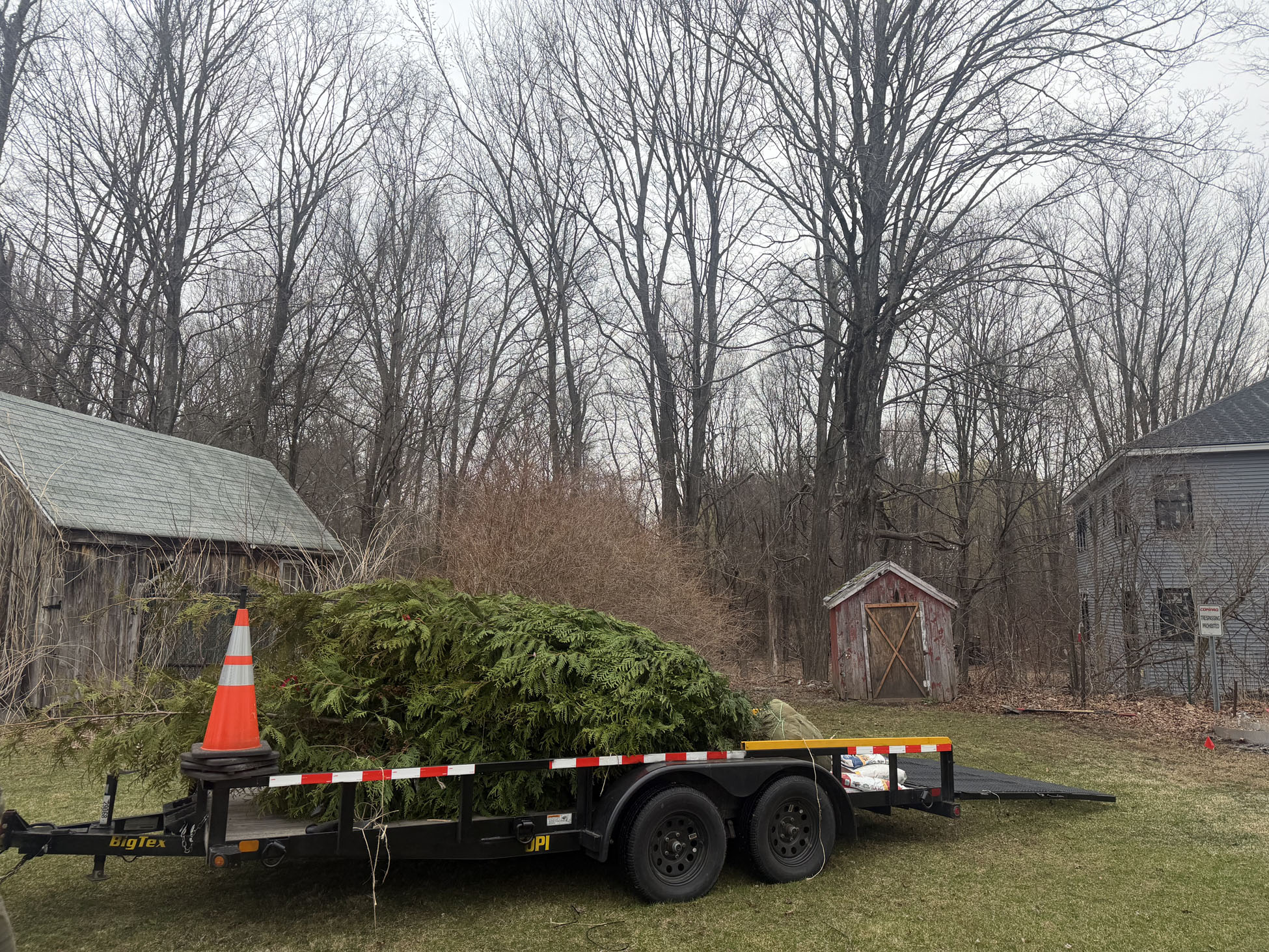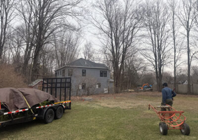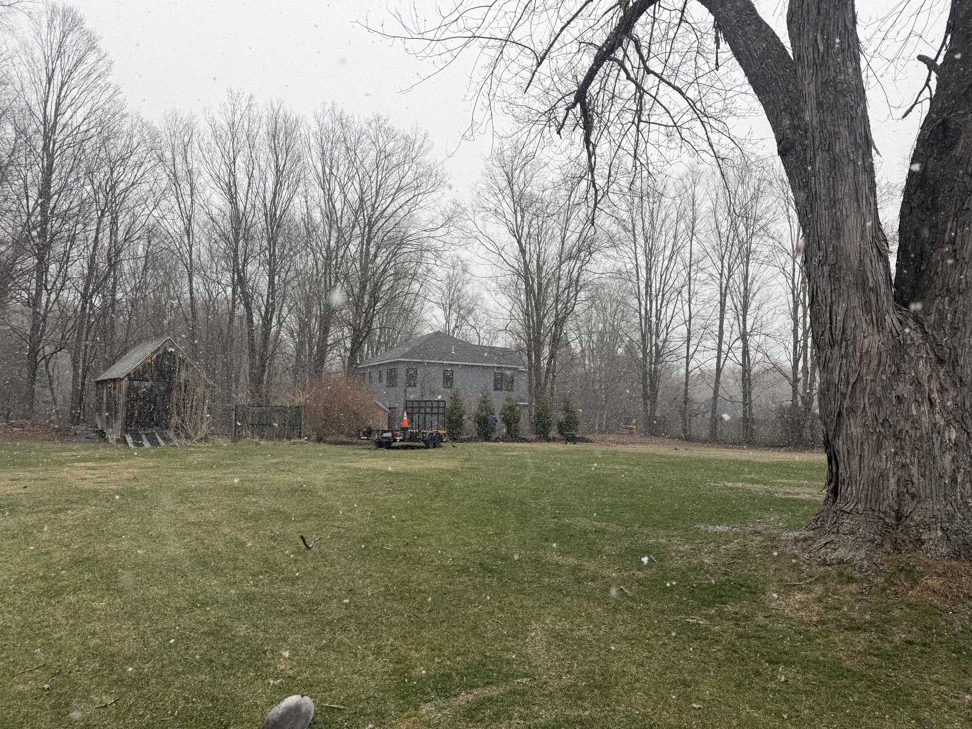 On planting day, the crew from Greenleaf’s Garden Design arrived ready to go. Using our Dingo auger, we efficiently handled the large root balls while working right through passing snow squalls—digging, setting, and backfilling each tree with precision.