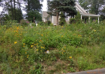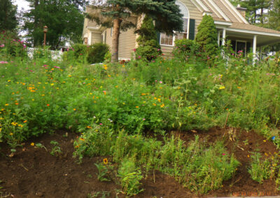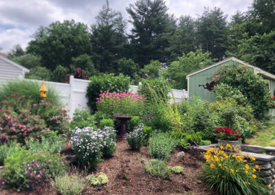 A good idea is to select flowers and vegetation for rocky areas that like to grow in crags and crevices. The use of flat stones, carefully placed rocks or a stone wall softened by plantings, make the rocks feel like they’ve always been there.